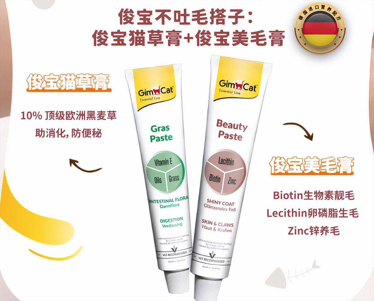 俊宝猫草膏采用了10%的顶级欧洲黑麦草成分,这种天然成分不仅可以助消化,还能有效预防便秘,帮助猫咪更顺畅地排出体内的毛发。而俊宝美毛膏则融合了生物素、卵磷脂和锌等多种营养成分,能够靓毛、生毛、养毛,使猫咪的毛发更加健康、浓密。