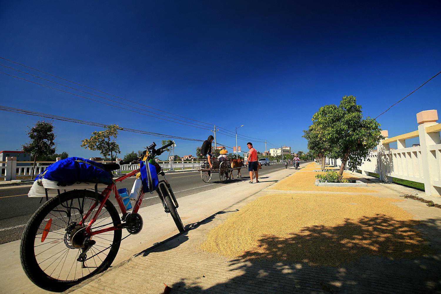 马路上晾晒着长长的两排稻粒,清新的空气和着淡淡的稻香,骑行其间,好享受~~