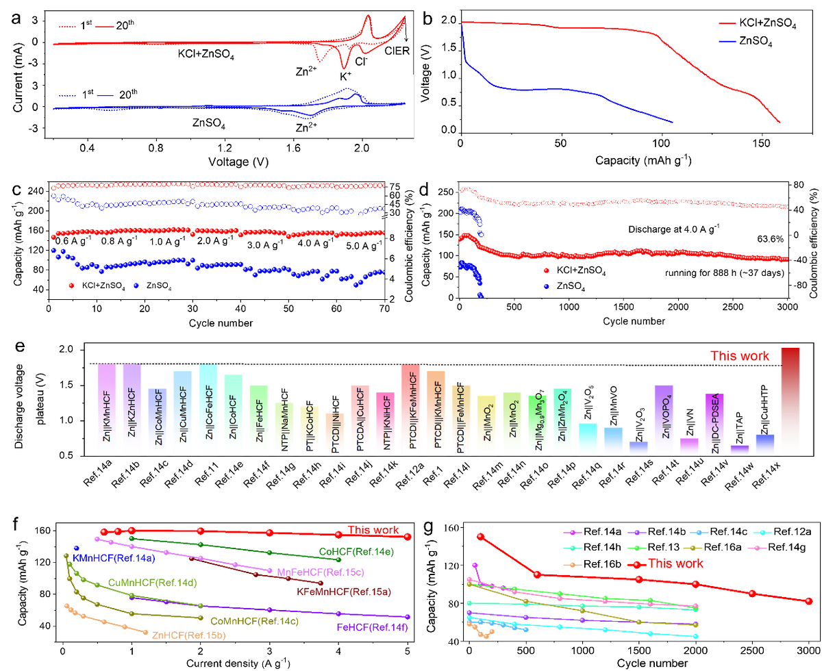 在纯ZnSO4电解液中,观察到明显降低的氧化还原峰表明正极材料在单独存储Zn2+时,性能在衰减。相反,KCl添加剂的引入带来了氧化还原峰位和峰强的变化,证实了显著不同的储能行为。在性能方面,正极材料的电压,容量,倍率和循环都得到大幅提升,且优于大多数文献报道的性能。