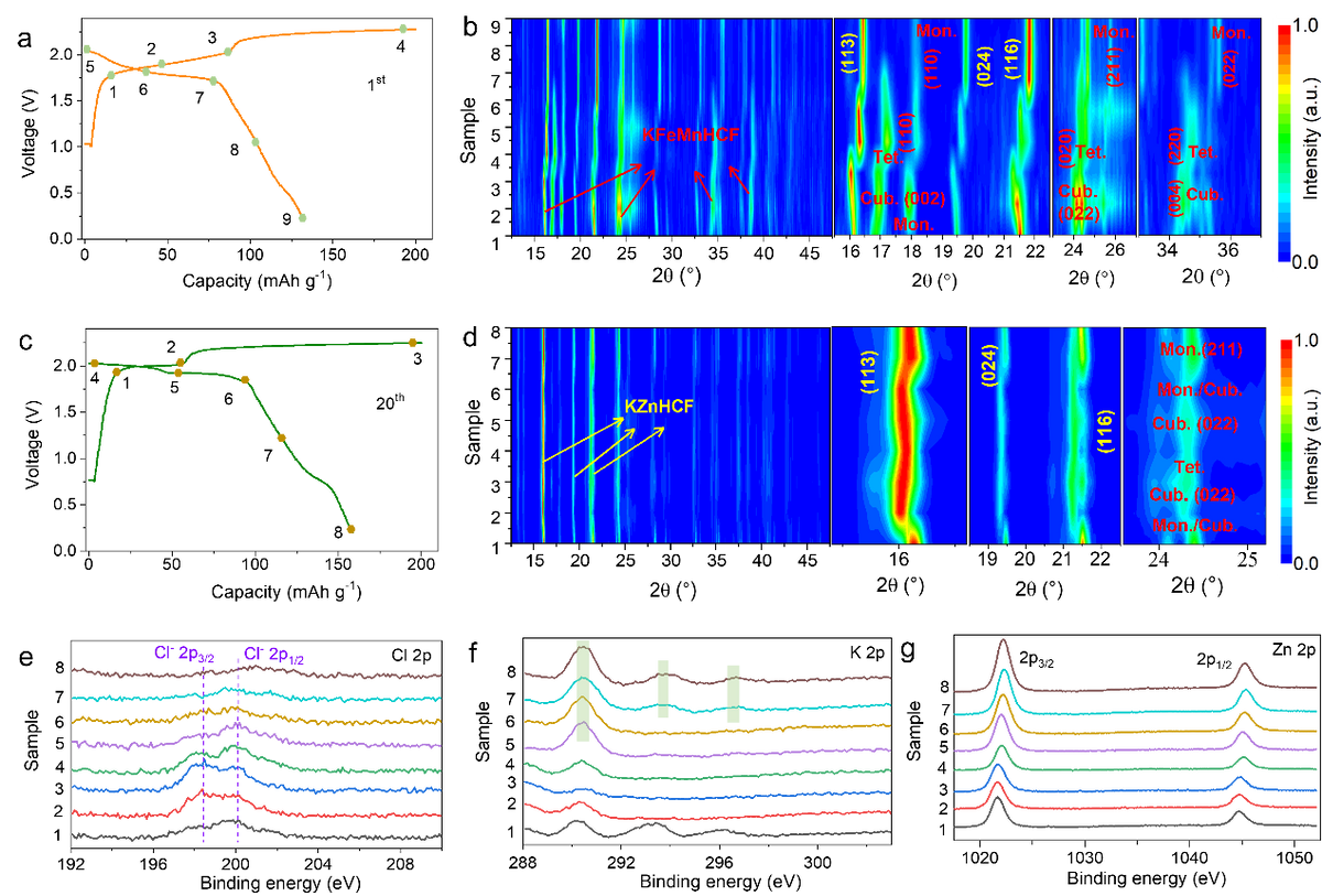 离子在相变前后正极材料中显著不同的脱嵌行为导致电化学性能的差异。相变前正极在离子脱嵌是材料从单斜相转变成立方相,随后转换成四方相,放电则正好相反。相变后正极在离子脱嵌时观察到可逆的峰位偏转。XPS数据证实了高电位Cl-和K+的脱嵌,而低电压下Zn2+占主导的离子脱嵌行为。
