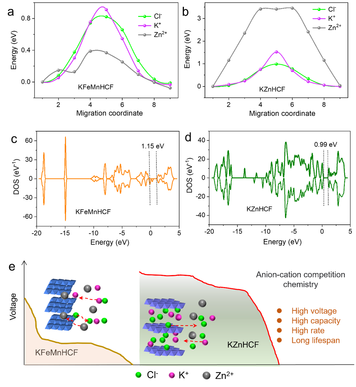 利用DFT计算去分析阴阳离子竞争化学的诱因及电化学性能提升的原因。相变前KFeMnHCF对Zn2+展示出更小的扩散能垒,而相变后的KZnHCF则对Cl-和K+展示出更小的扩散能垒。因此相变前Zn2+占主导的脱嵌行为转变成相变后的Cl-和K+。此外,相变后材料的导电性也得到加强。因此,电池的放电容量,电压平台,倍率和循环性能都得到明显提升。