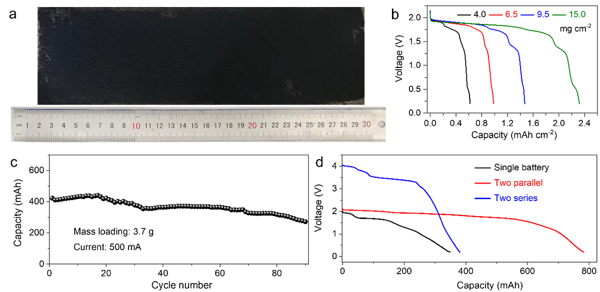 规模化储能的实际应用要求电池在更大容量下具有优异的电化学性能。为此,利用自制的电池测试装置演示了400mAh的Zn||KFeMnHCF电池。当KFeMnHCF正极的负载量从4mgcm-2增加到15mgcm-2时,电池的面积容量呈线性增长。而电池的负载量达到3.7g时,单个Zn||KFeMnHCF电池实现400mAh的放电容量和1.75V的放电电压。电池在0.135mAg-1下循环90次。随后,电池采用串并联的连接方式去获得更高的放电容量和电压。两个并联电池的放电容量可达到800mAh,放电电压平台约为1.85V,而两个串联电池的放电容量和电压分别为400mAh和3.5V。所取得的优异性能表明,基于阴阳离子竞争化学制备的Zn||KFeMnHCF电池具有显著的可扩展性和工业应用潜力