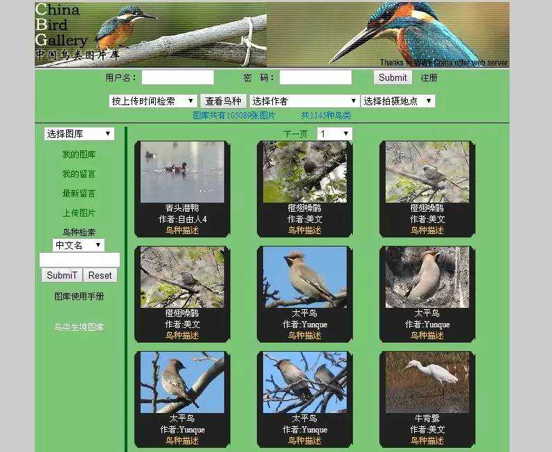 这是由北京资深鸟类爱好者设计内容及制作的网站,里面主要是各类鸟类知识、鸟类摄影图库以及摄影器材、技巧介绍。