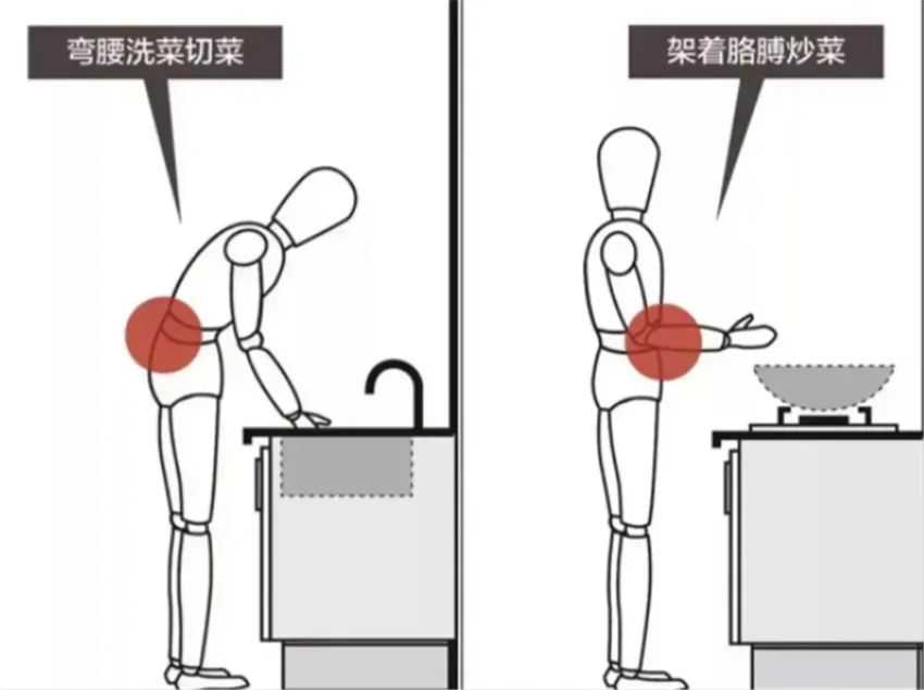 炒菜区和洗菜区应当设置高低台,以免日后出现”驾着胳膊炒菜、弯着腰洗菜“的状况。