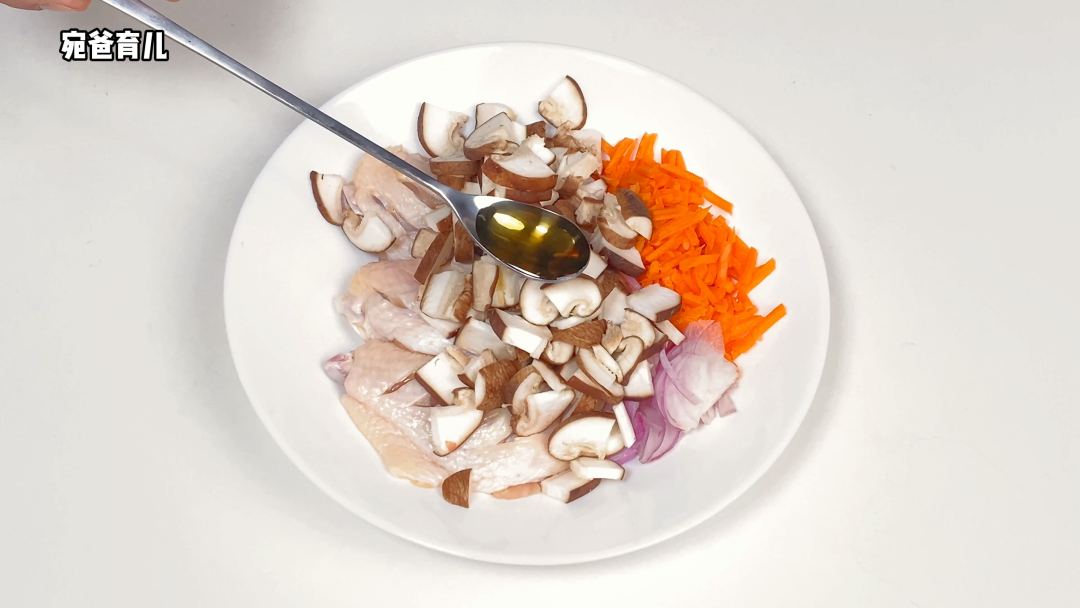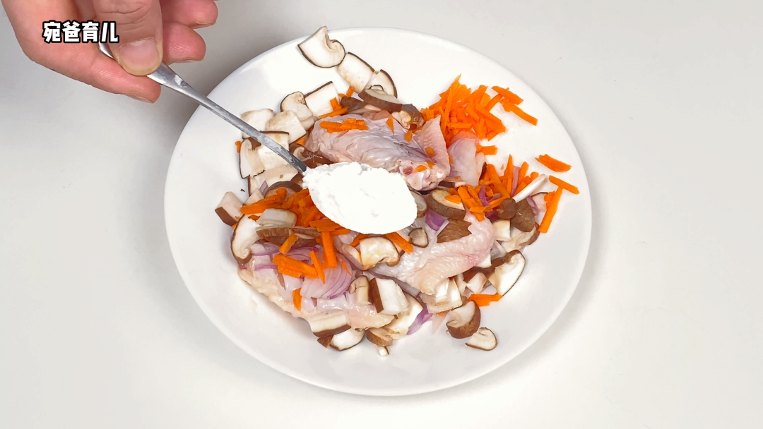 用鸡中翅、胡萝卜、洋葱和香菇进行组合