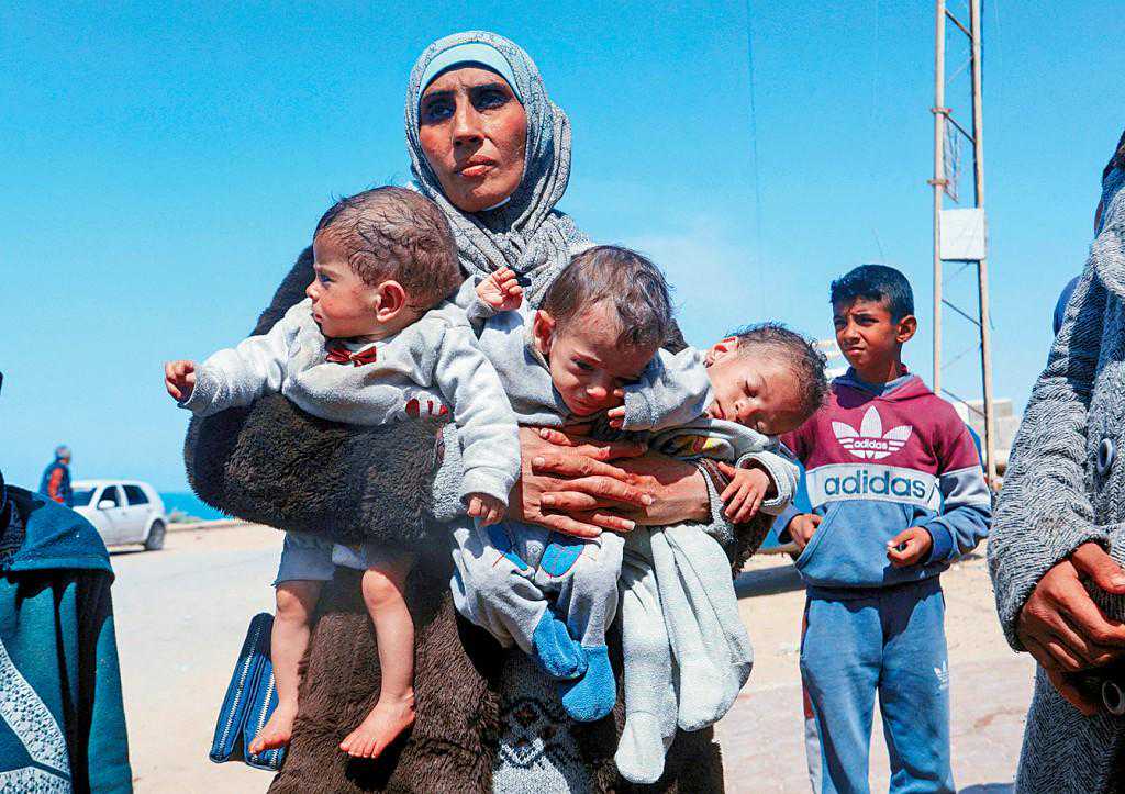 一名巴勒斯坦妇人带着3个营养不良的孩子,从加沙中部向南迁。
