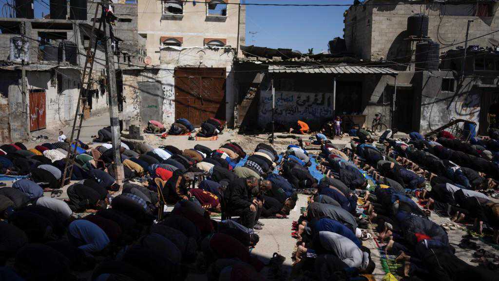 巴勒斯坦人在拉法一所被空袭击毁的清真寺附近守斋戒。