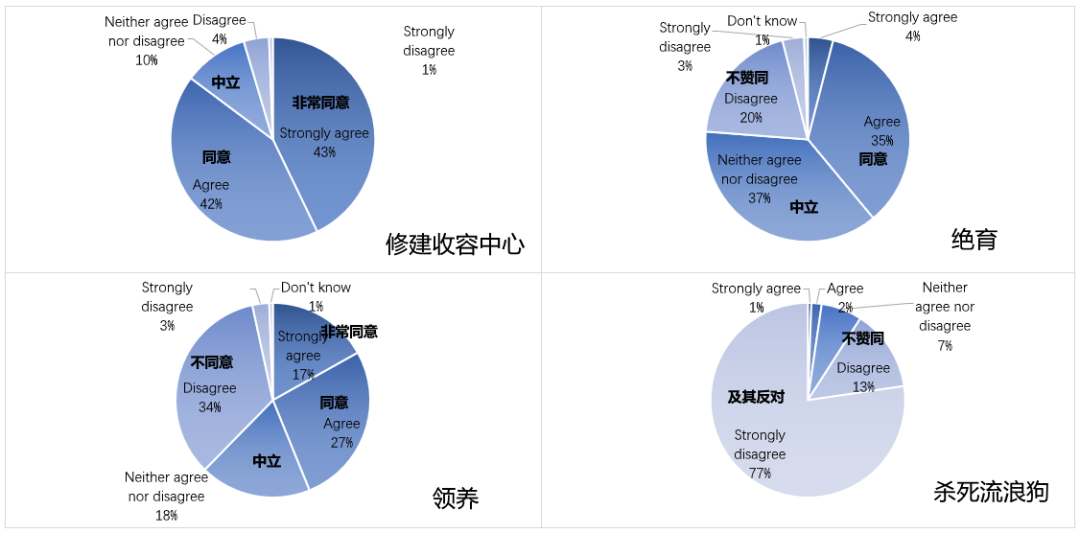 我们在当地做了一个将近200多人的调查,有超过90%的牧民都不赞成(包括极度反对和不赞同的)通过捕杀的方式解决流浪狗的问题;而最获大家支持的方式是修建收容中心;同意绝育的人数占超过三分之一,对绝育表示中立态度的人最多,不同意的则有20%。