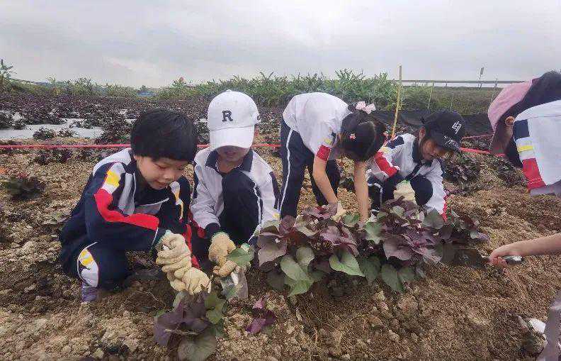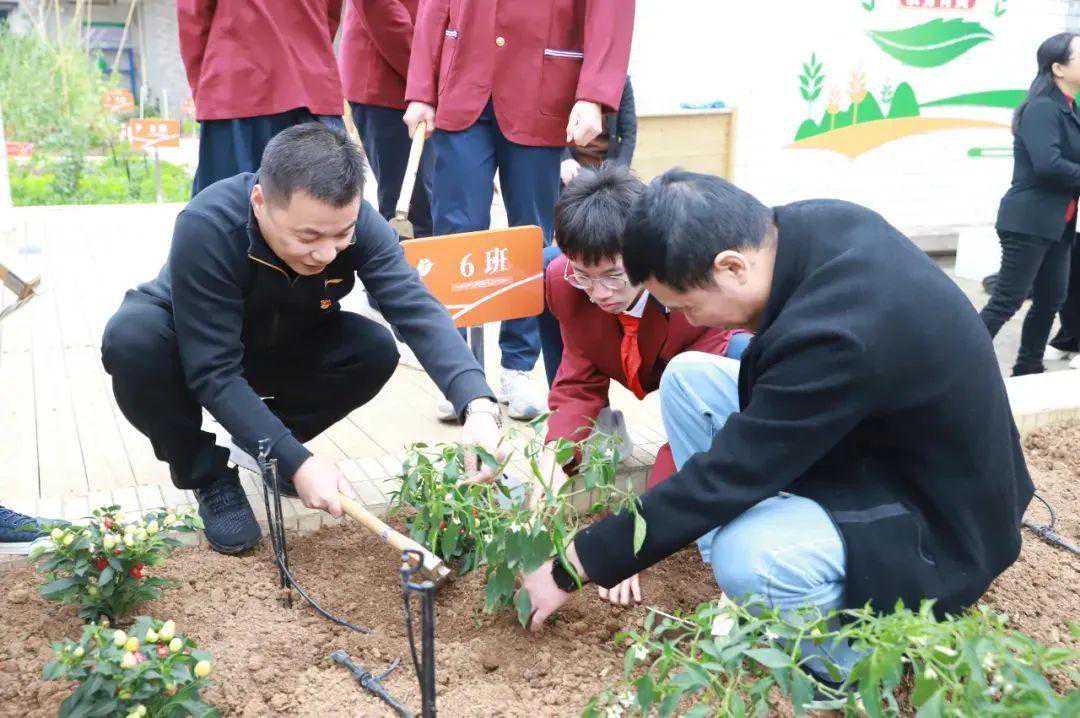 在佛山市第三中学初中部,教育局领导与街道领导、学校行政代表、学生代表共同在校内春晖园和学校利用现有资源开辟的劳动教育基地“丰收园”内开展植绿活动,在劳动中体验快乐。