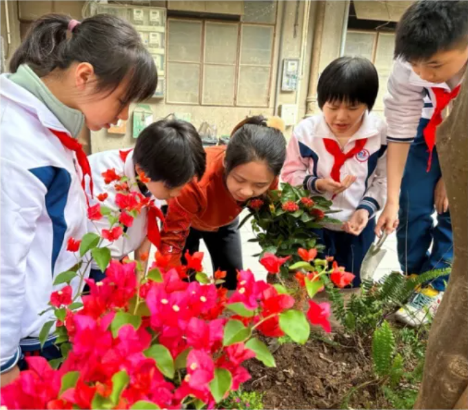 在佛山市第二十四小学,学校大队部在祖庙街道妇联的倡议和指导下,联合同安社区共同到任围街区的青砖小巷、镬耳大屋间,种下了桂花、龙船花、三角梅等植物,为这片古老的历史文化街区增添生机。