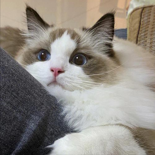 另外,布偶猫的耳朵尖端是圆圆的,耳部微微向前倾,这是串串布偶猫装不出来的。