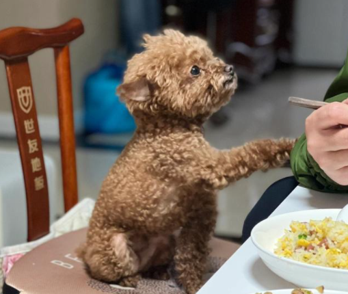 泰迪是一只小馋狗,主人刚撕开零食的包装袋,它就会马上赶到,用湿漉漉的大眼睛期待地看着你,希望你能从手缝里漏点吃的给它。如果你还没有接到它的暗示,它马上就会开始扒拉你,一副你不给吃的它就不停手的“霸道”模样,让人哭笑不得。