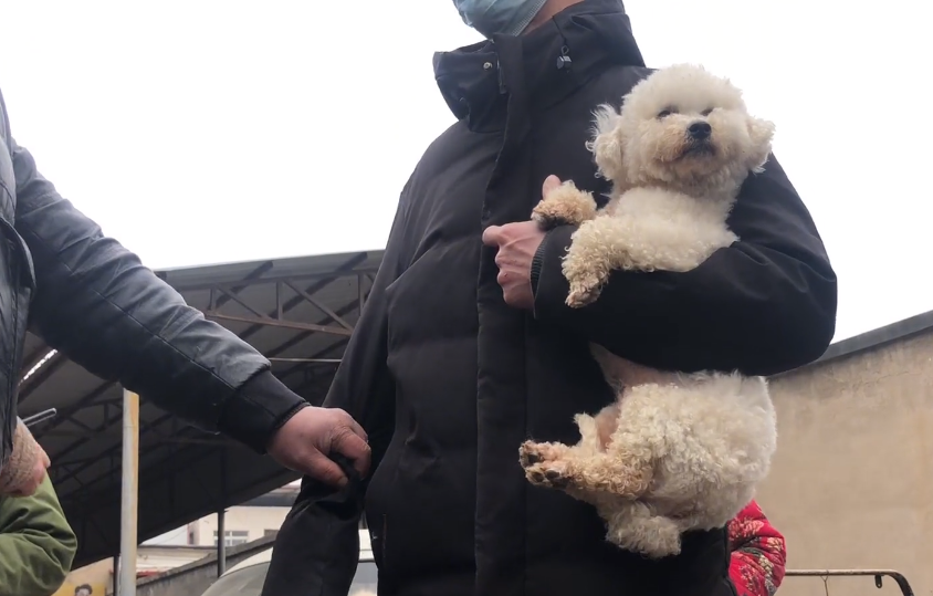 小伙手里的比熊犬似乎也没有见到原主人的欣喜