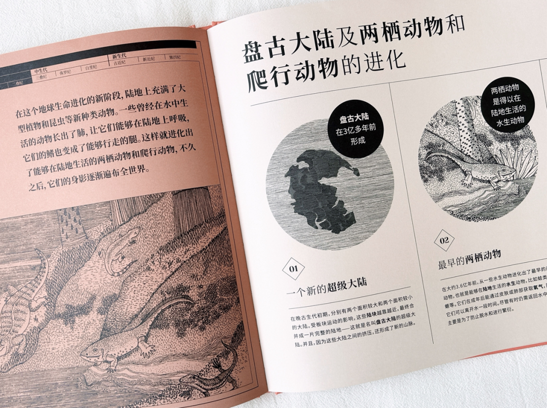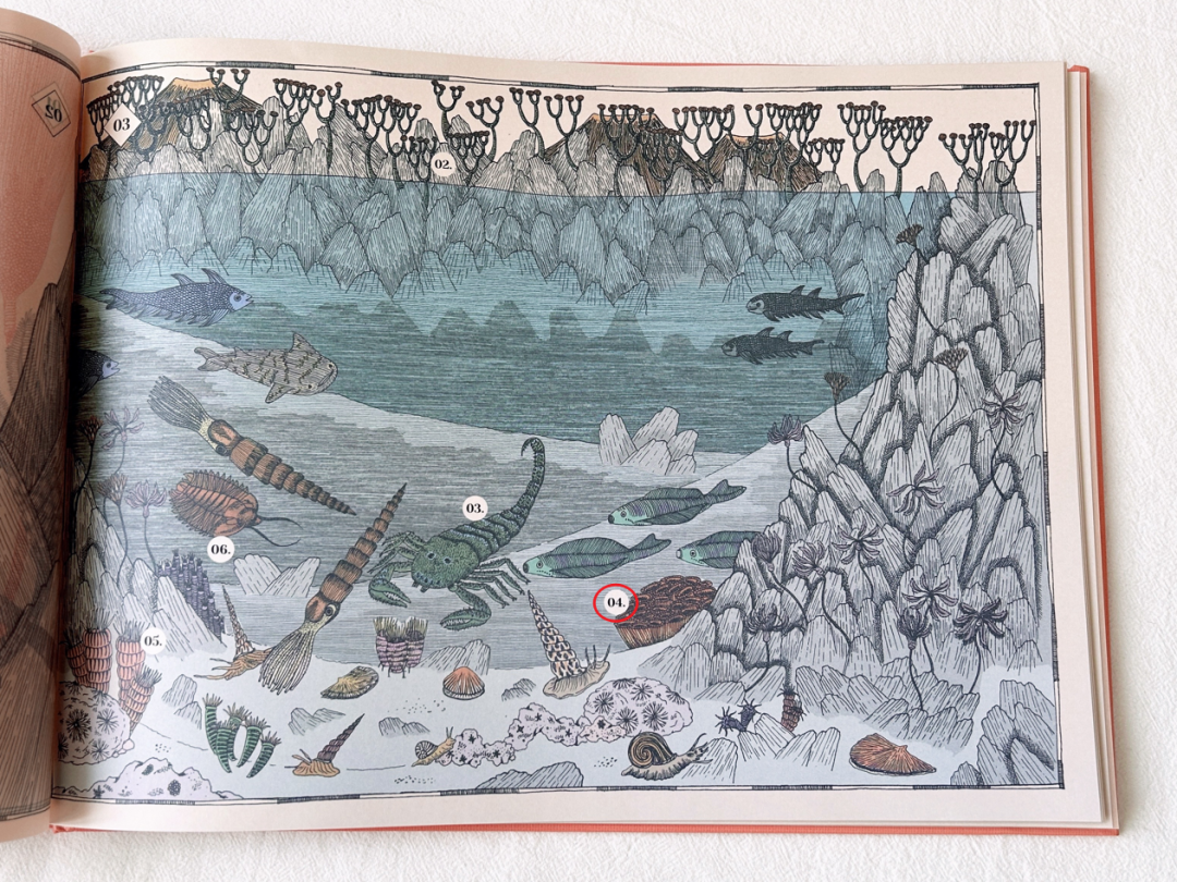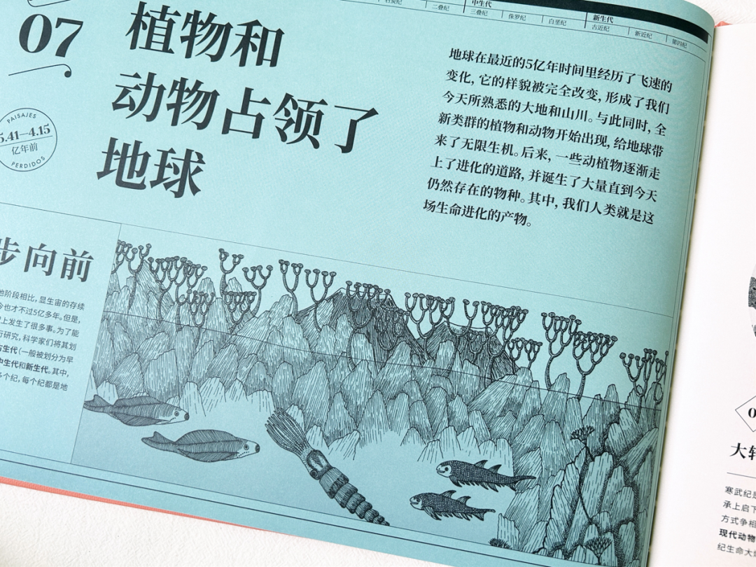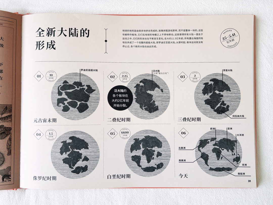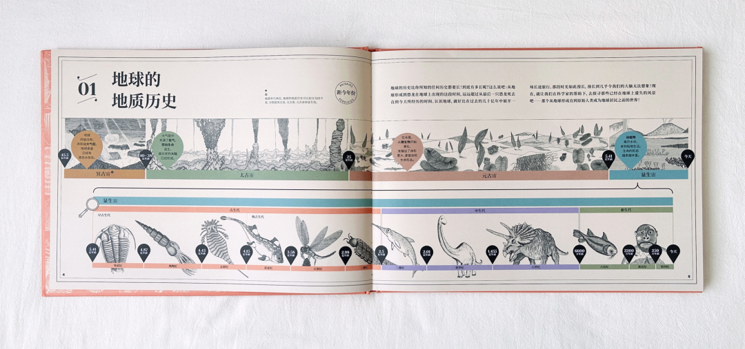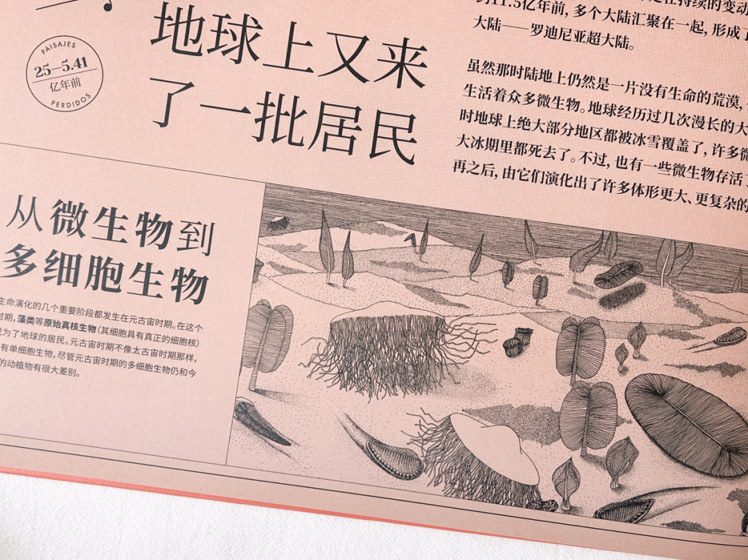 在《地球上遗失的风景》内文中,作者以地球演化的时间轴为叙事脉络,通过浅显易懂的文字、标线设计、编号讲解等,串联起地球各个演化时期的独特风景。精炼的文字让读者能迅速获取对应图片的主要意涵,理顺地球演化的先后顺序、化石与年代的对应关系,并为读者讲述了那些复原的遗失风景中的主要看点。