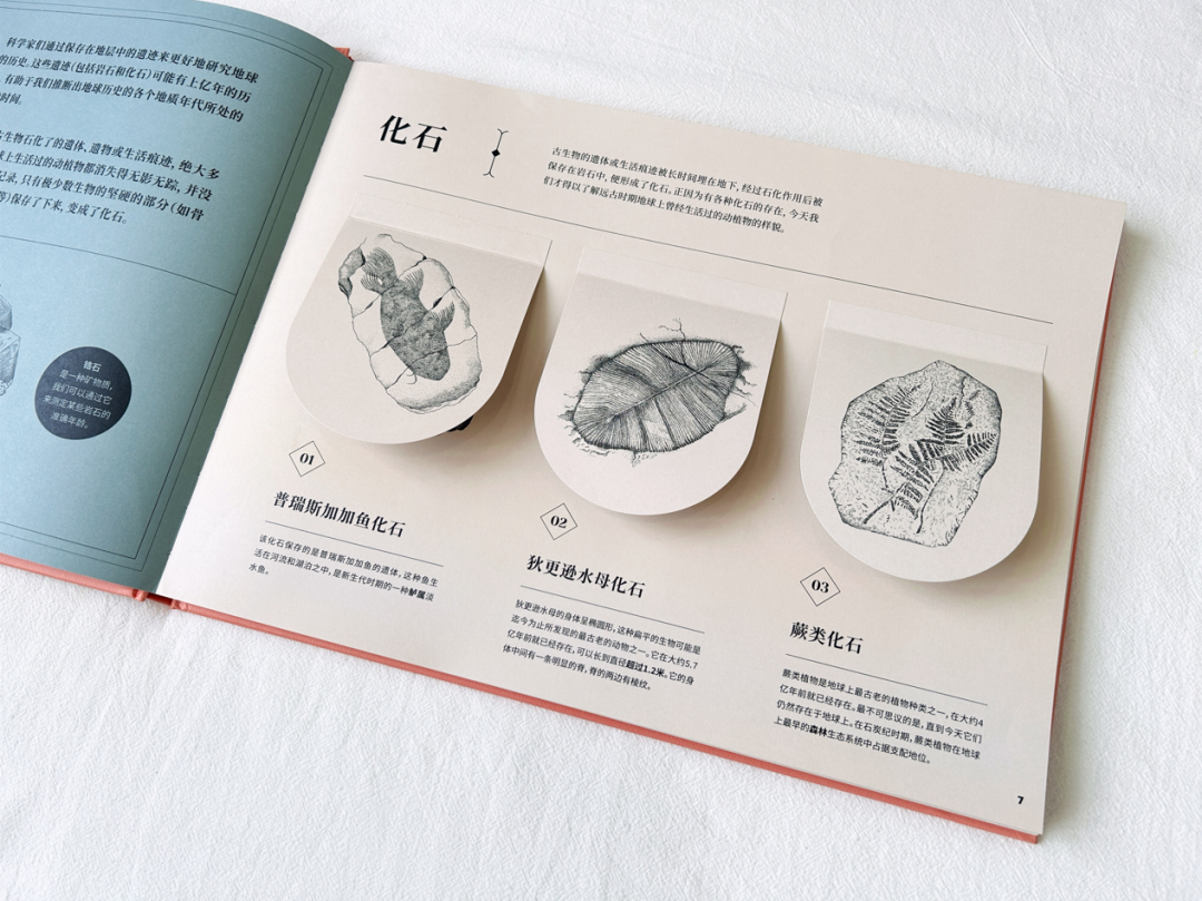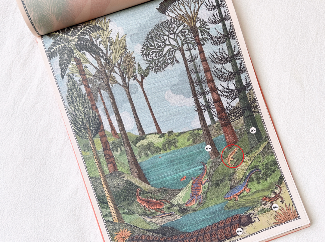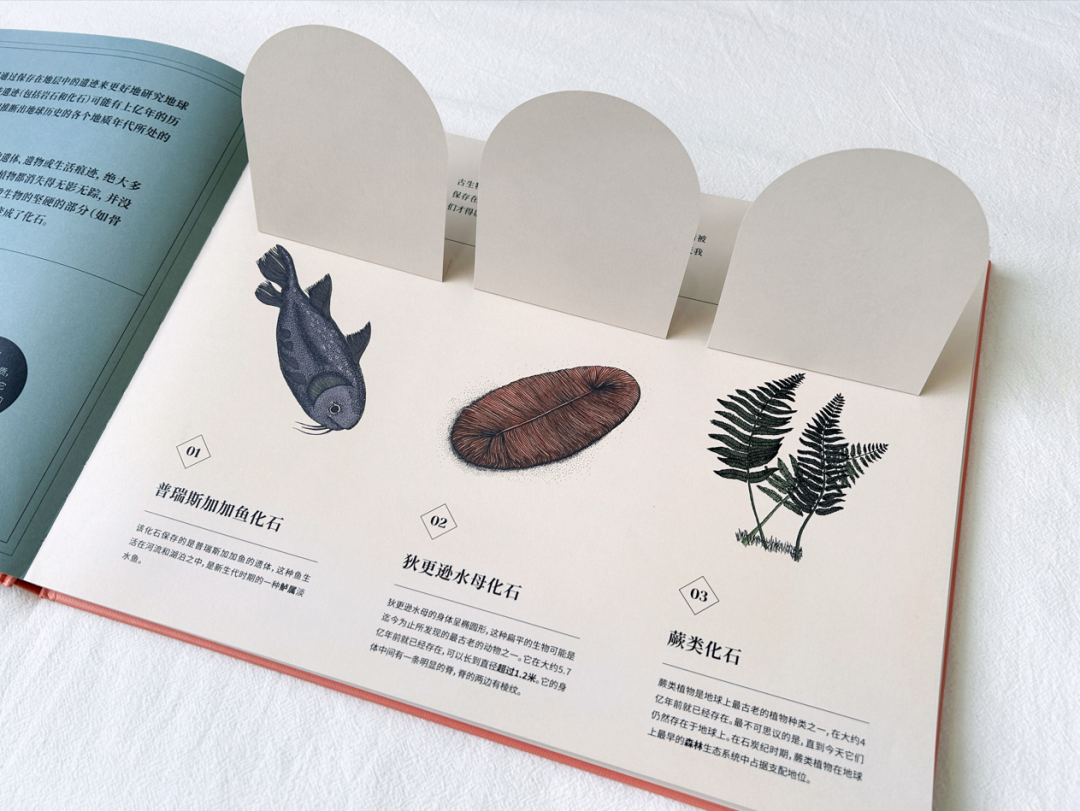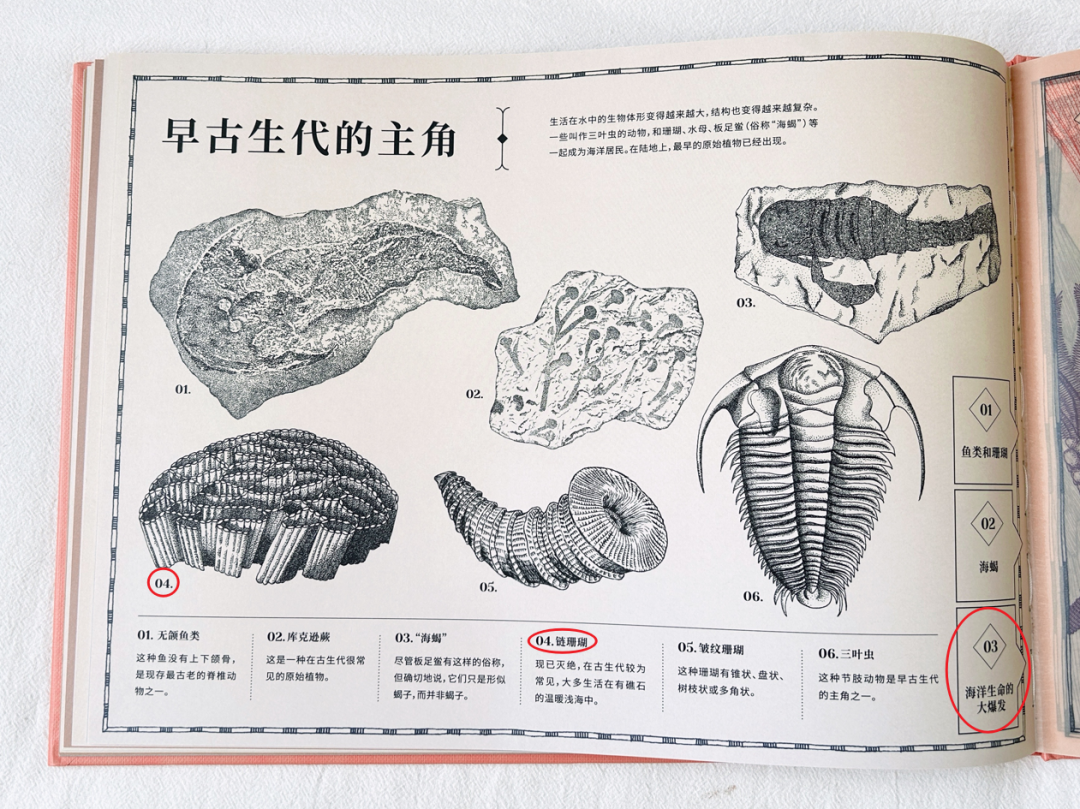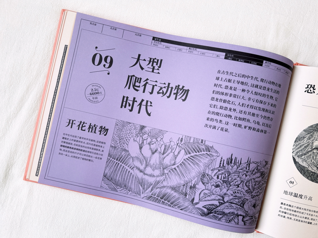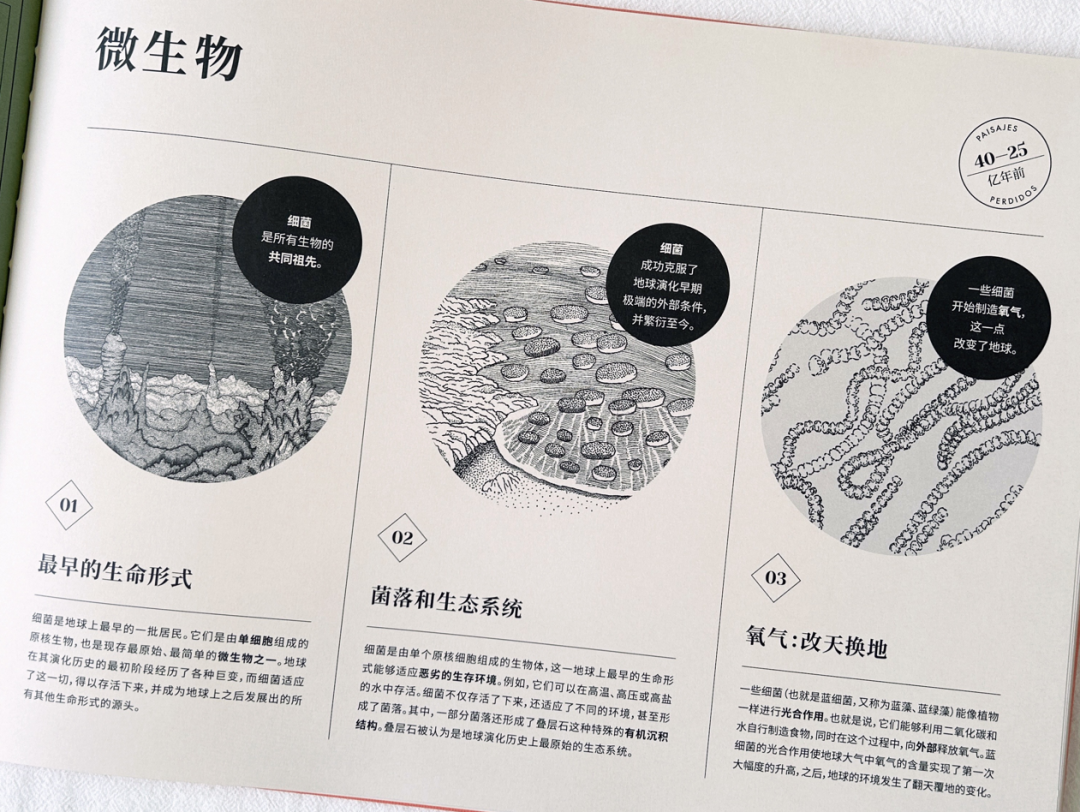 在《地球上遗失的风景》内文中,作者以地球演化的时间轴为叙事脉络,通过浅显易懂的文字、标线设计、编号讲解等,串联起地球各个演化时期的独特风景。精炼的文字让读者能迅速获取对应图片的主要意涵,理顺地球演化的先后顺序、化石与年代的对应关系,并为读者讲述了那些复原的遗失风景中的主要看点。
