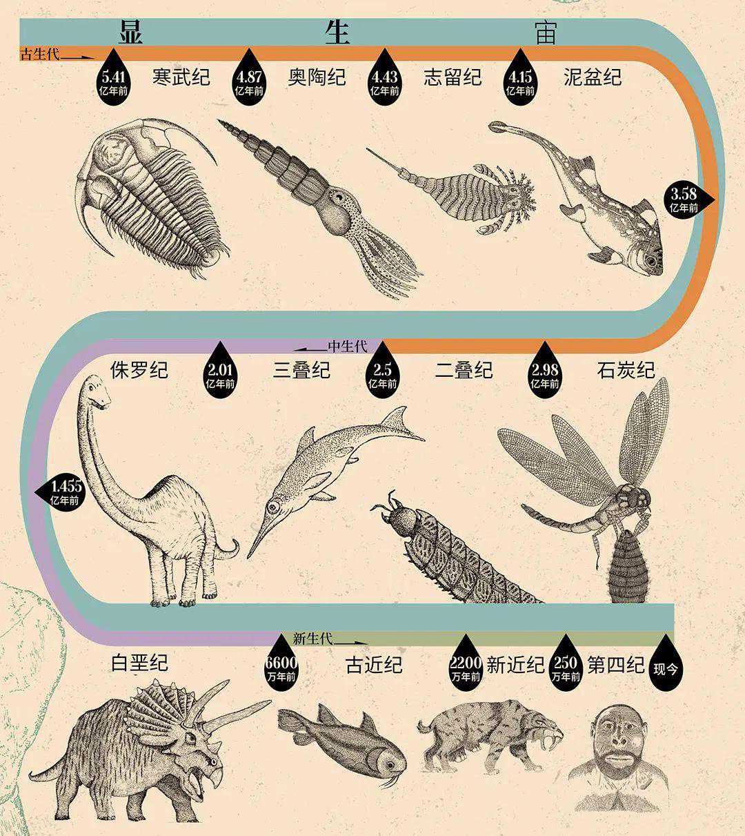 接下来,先后出现在地球生命史上的重要成员,都在时间轴上占据位置。