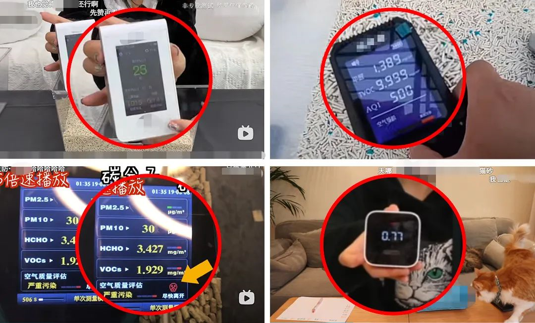这类仪器早就被我们辟谣过了,有很大的误差,放个香薰都能测出甲醛超标。这些仪器显示“超标”,很可能是因为猫砂中添加了香精,这些电化学(扩散式)仪器误把猫砂的香气成分判断成甲醛,从而显示甲醛超标,误导大家。