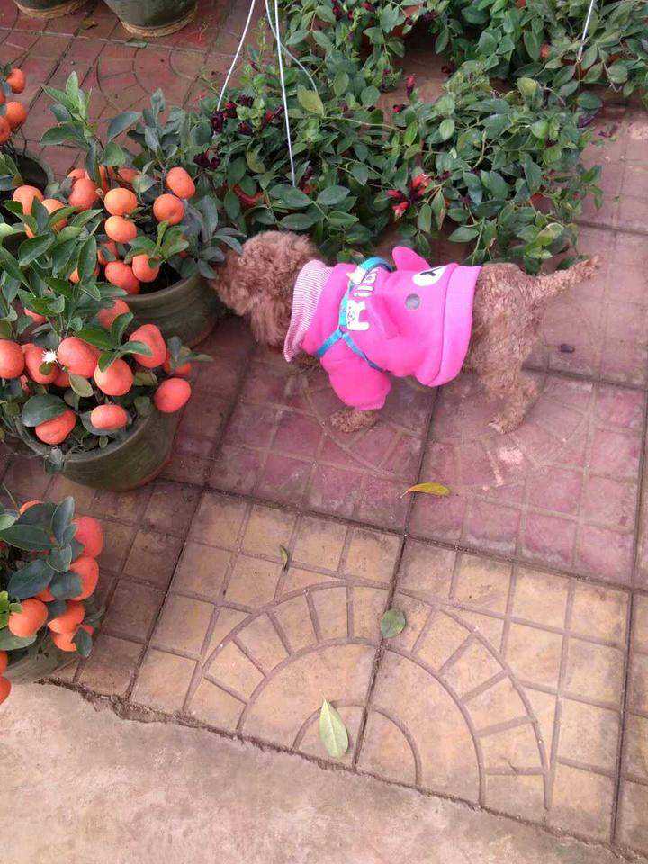 散步前,我会给它穿戴好:粉红色的小袄或衬衣,褐色的小笼嘴,配上一条蓝色的狗绳。见的人无不夸它长得俊。在公园散步,回头率百分之百!小孩子看见都稀罕的不得了,嘴里一个劲地说:“小狗狗,好可爱呀!我也想要!”每次给它穿衣服时,它都会乖乖地站到沙发上一动不动,像个小人儿似的,任凭我摆布,真是有趣得很!