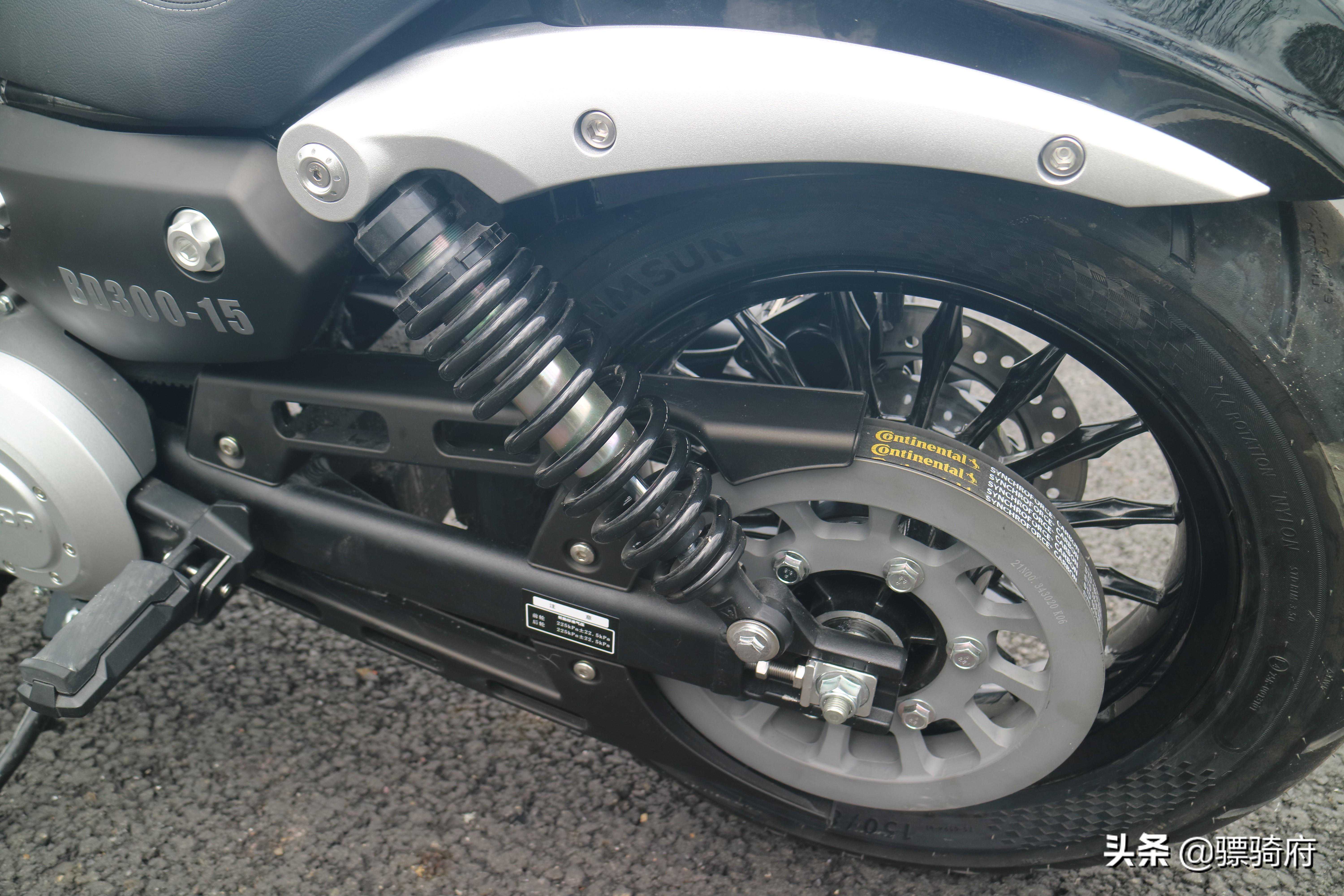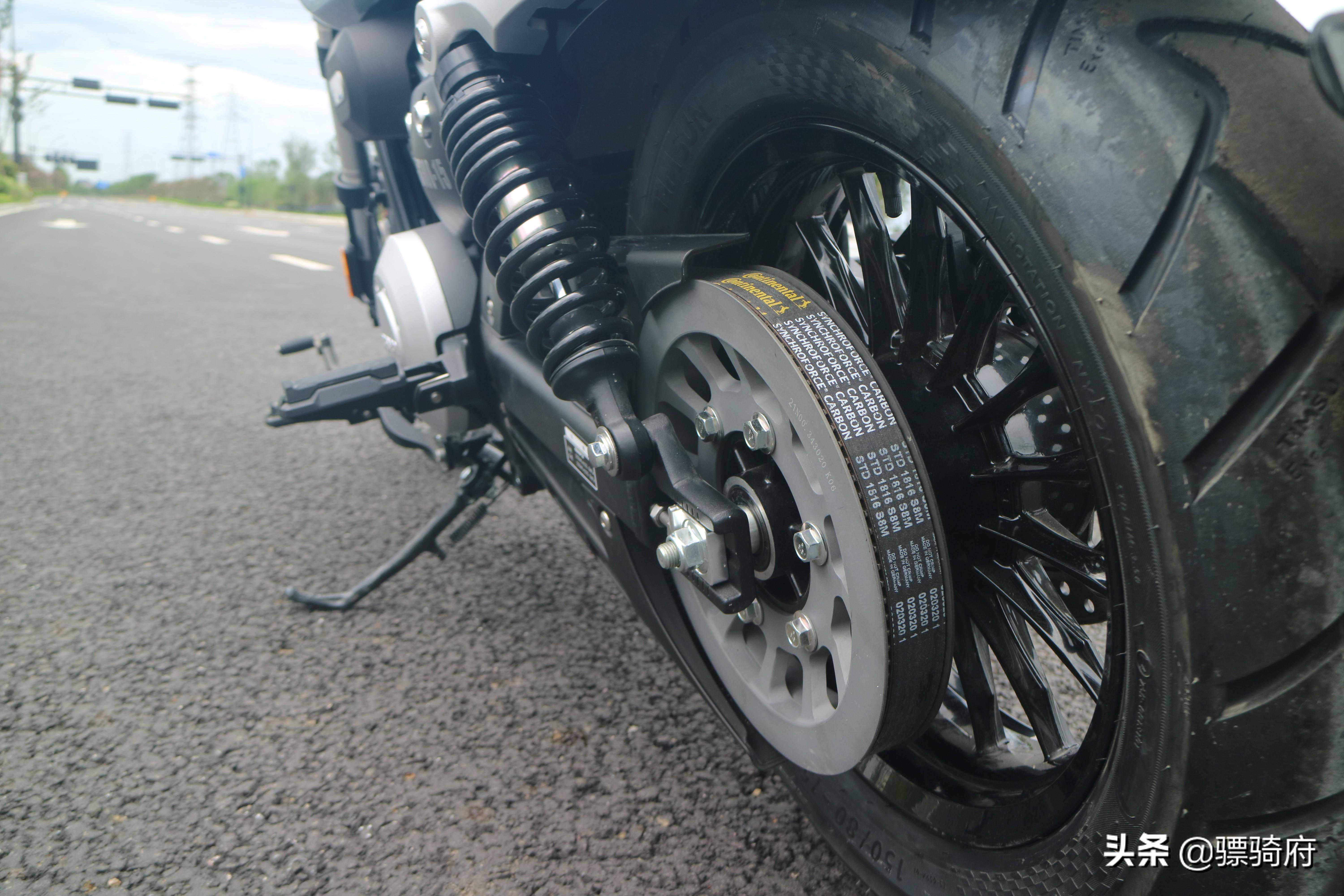 实际上马牌的皮带传动已经在奔达FUN250上面装备了,并不算新鲜,但是与V缸的发动机组合在一起,这就有点纯美式巡航的风范了。皮带传动质量轻,运转惯性小,不会给发动机输出造成大的负累,另外使用寿命长,几乎不用维护保养调节,而且最重要的是,从根本上解决了链条传动响声大的毛病。这套皮带传动系统,当然在成本上也远超链条传动,据工作人员介绍,采购成本数倍于链条传动。