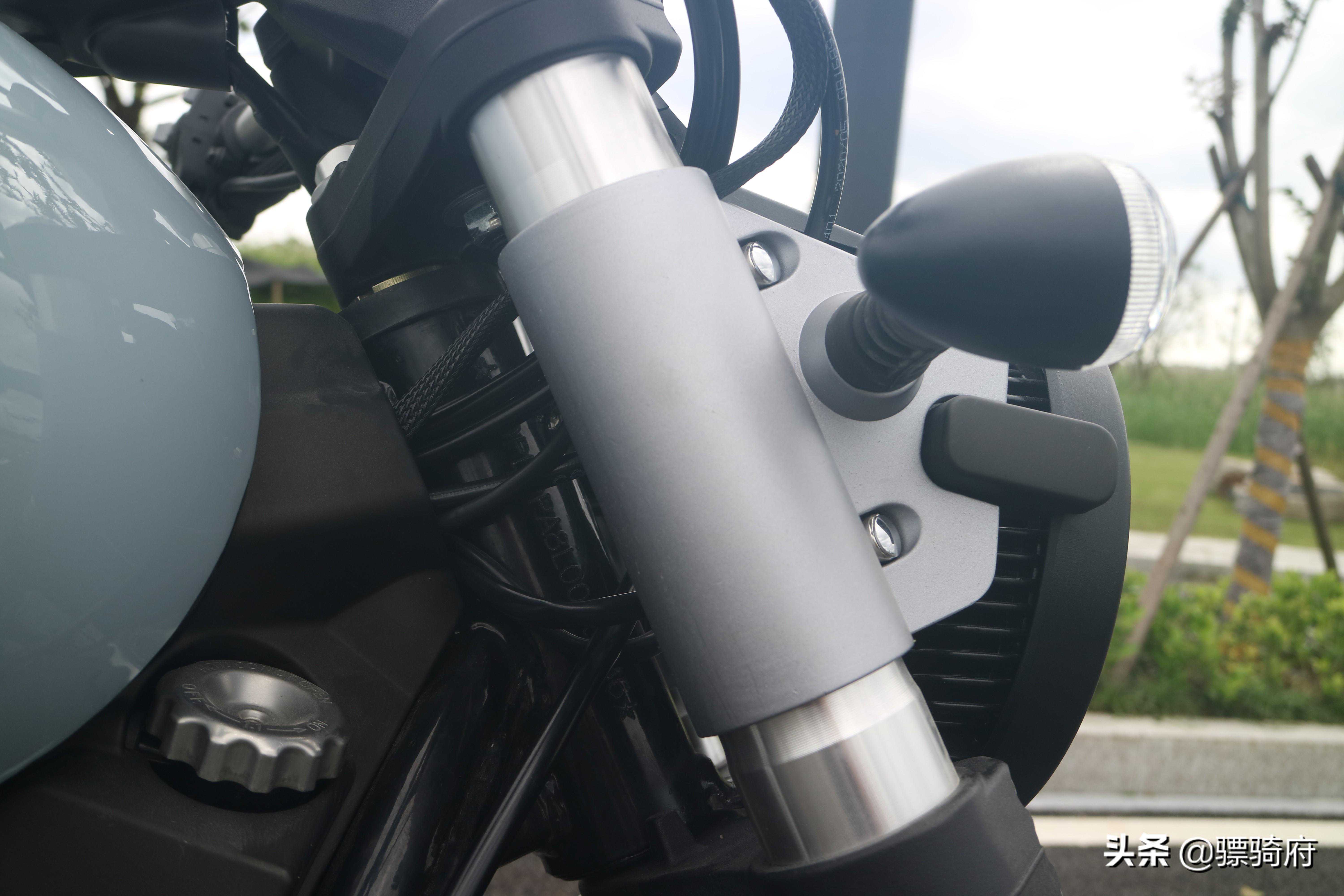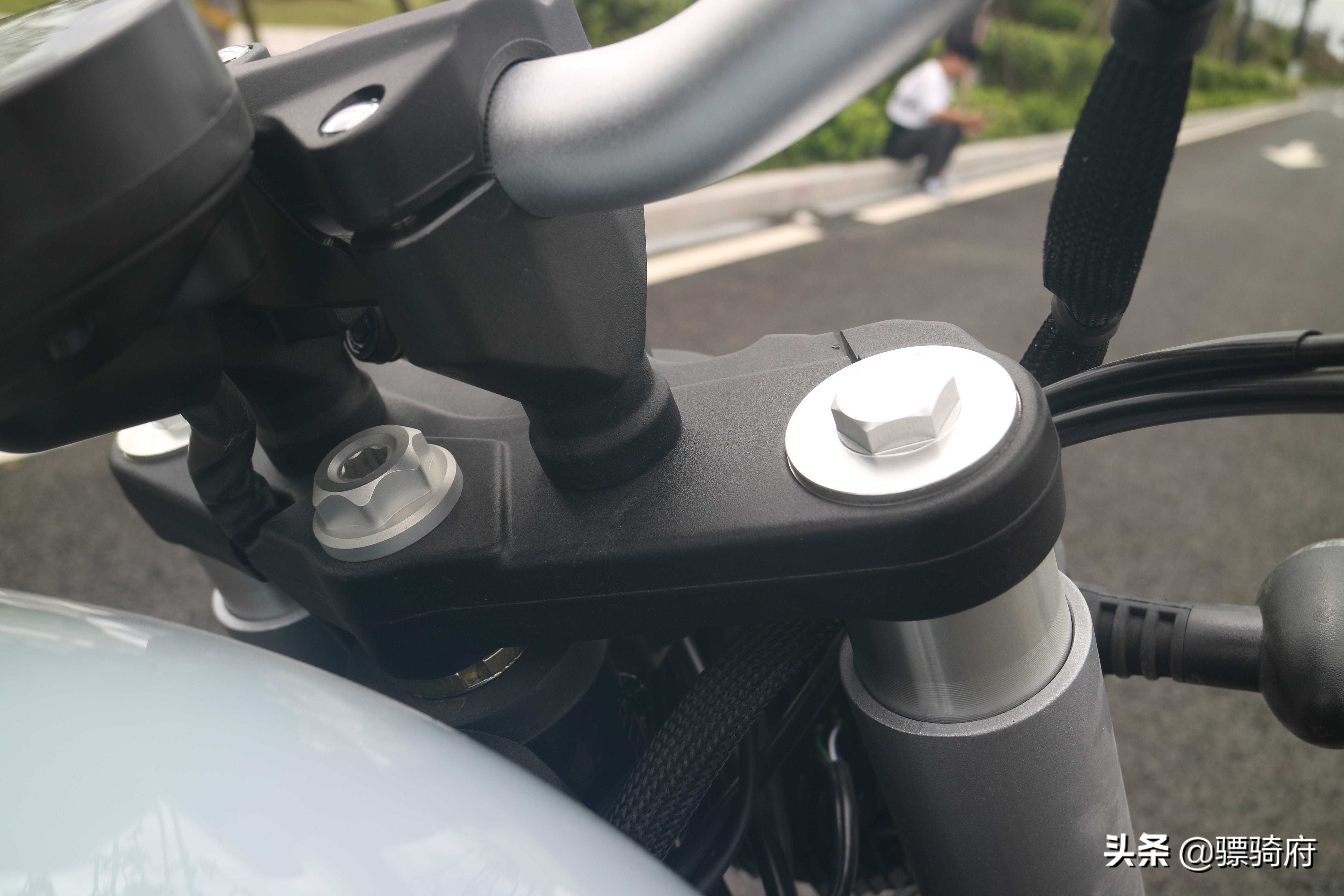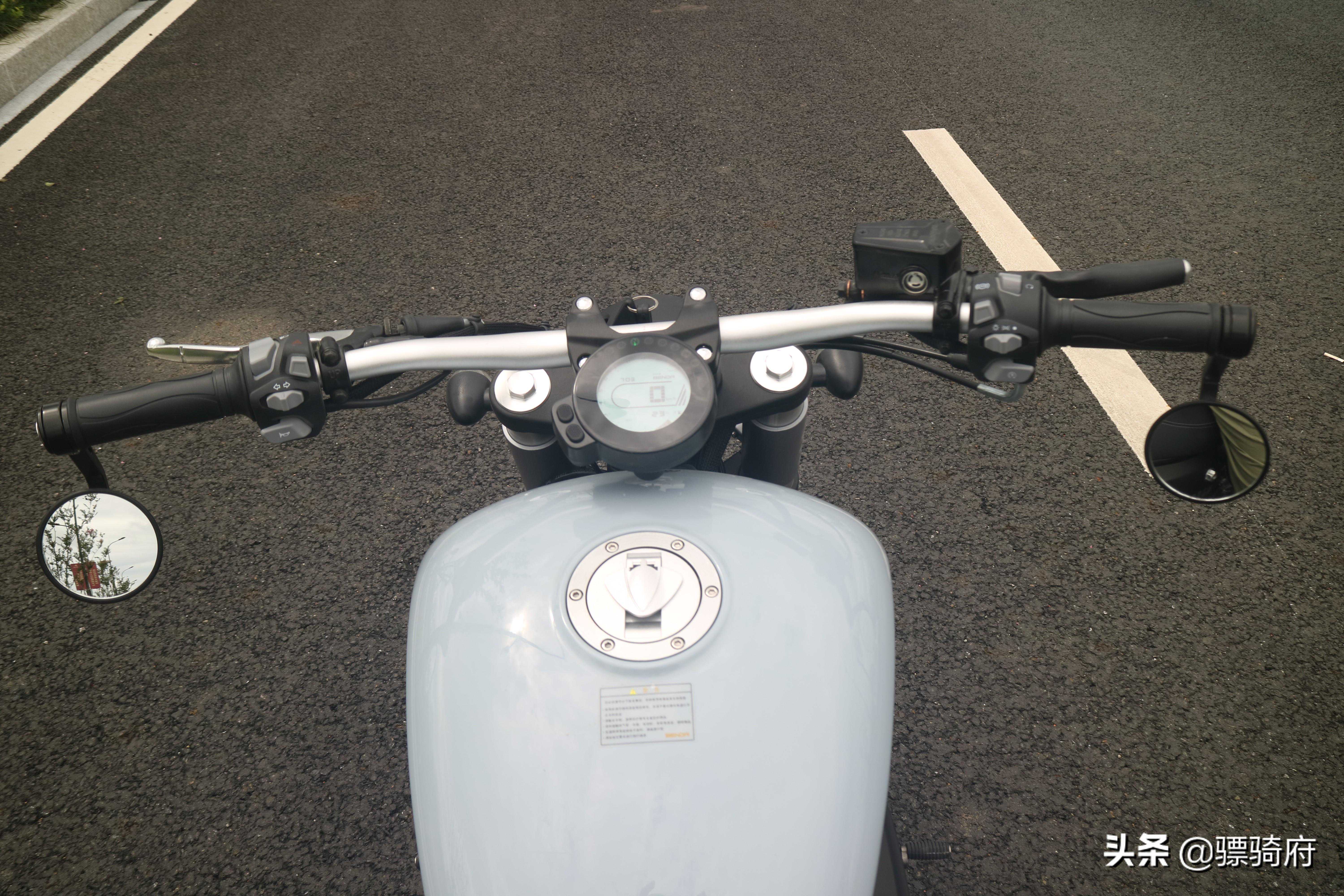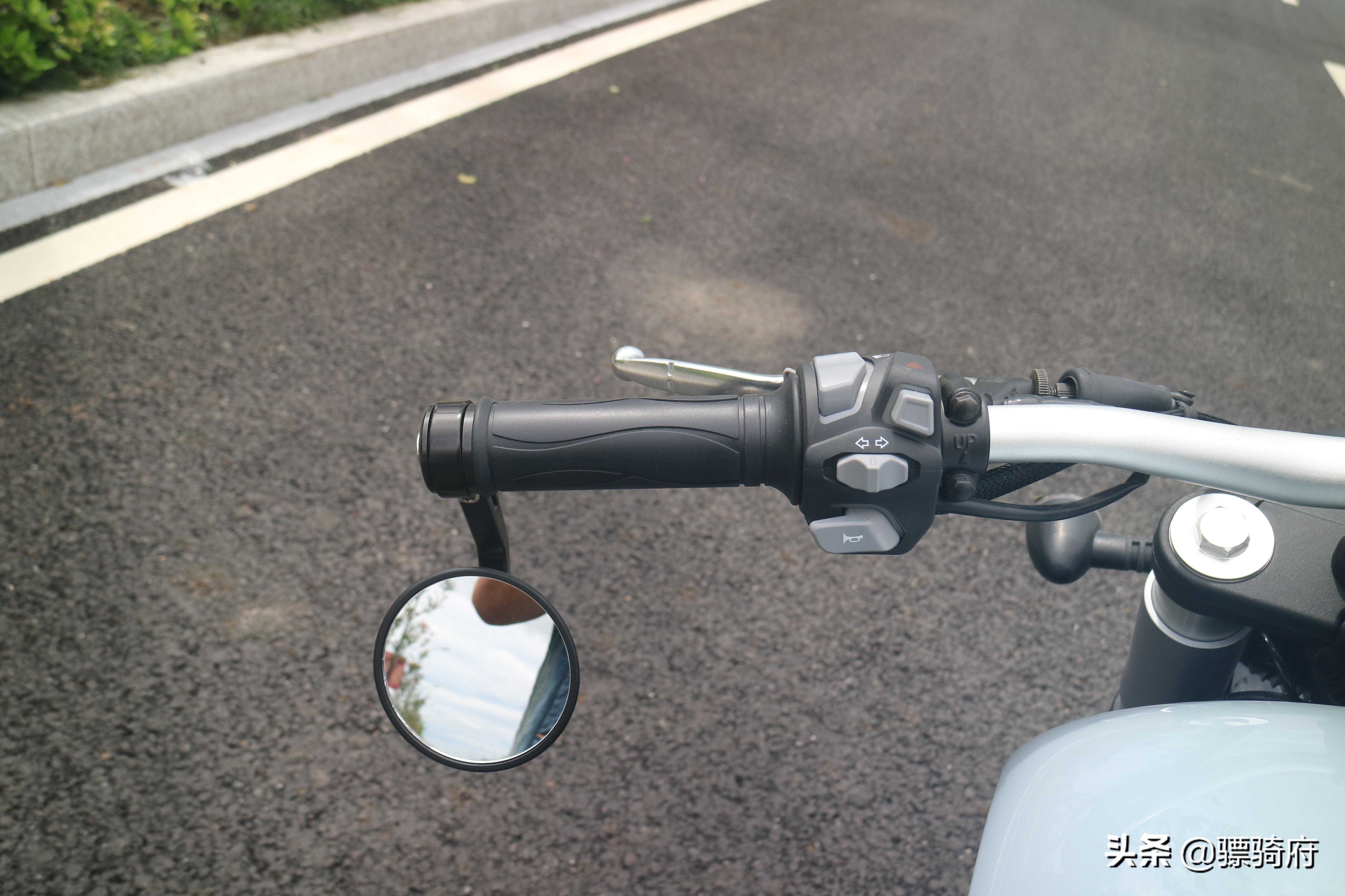 使用了双油门线设计,后视镜设计在了手把末端,体现复古范儿,如果不喜欢镜片向下的设计,可以很方便的左右互换,就能将镜片朝向上方,大多数人应该更喜欢这种方式,因为我实地试骑时发现镜片如果向下的话,双手会遮挡住镜片,并不实用。