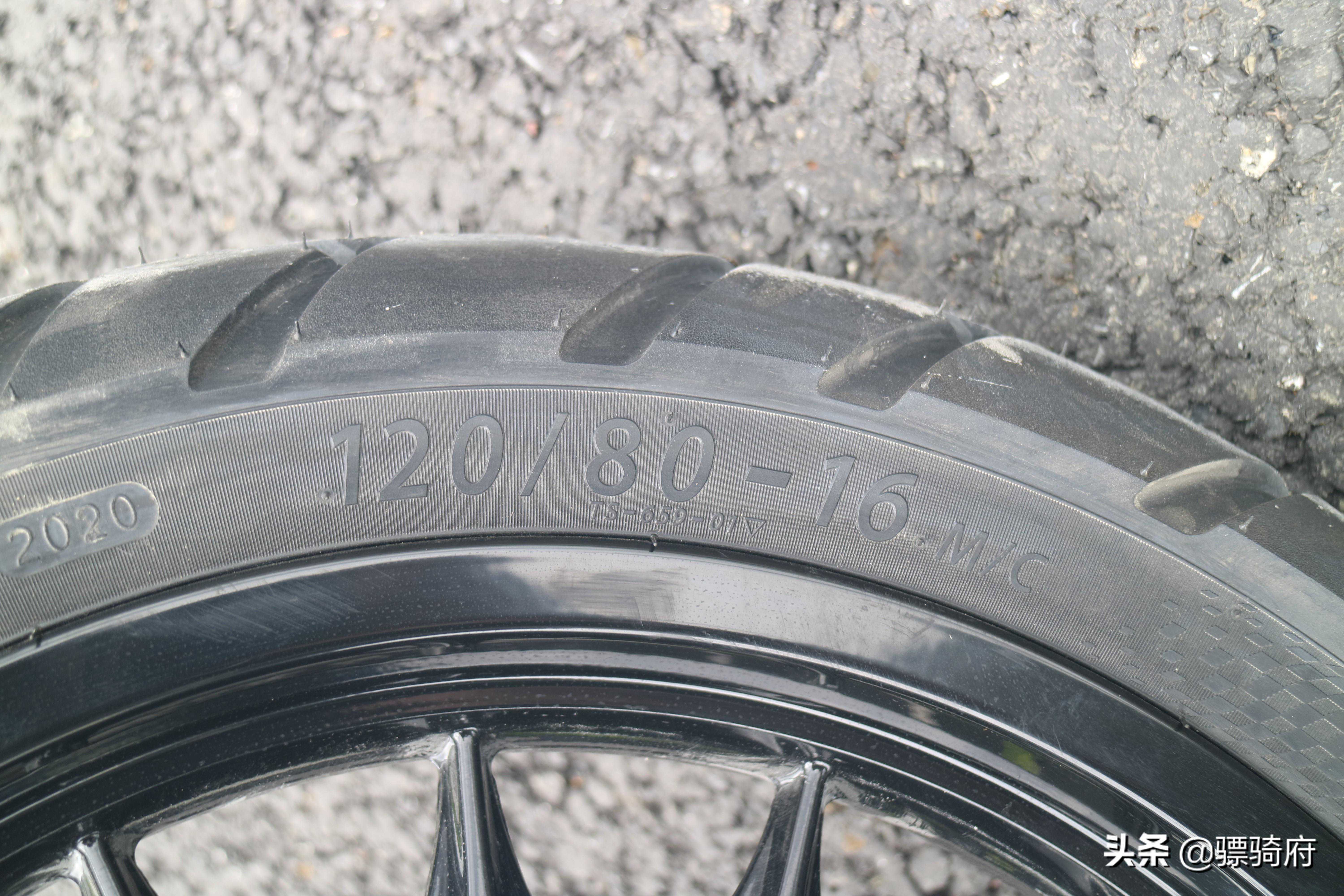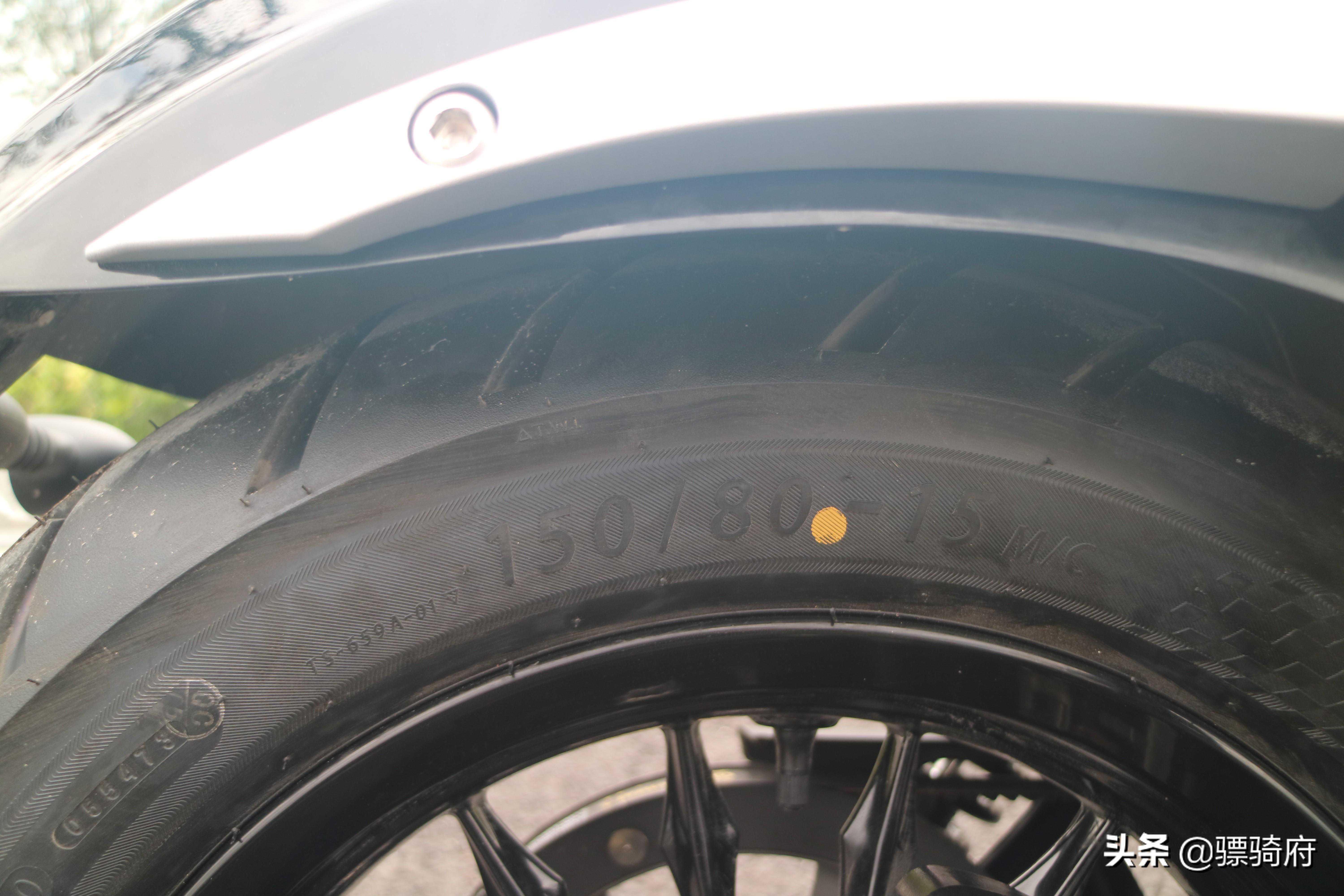 前后轮为滕森品牌轮胎,前轮规格为120/80-16,后轮规格为150/80-15。