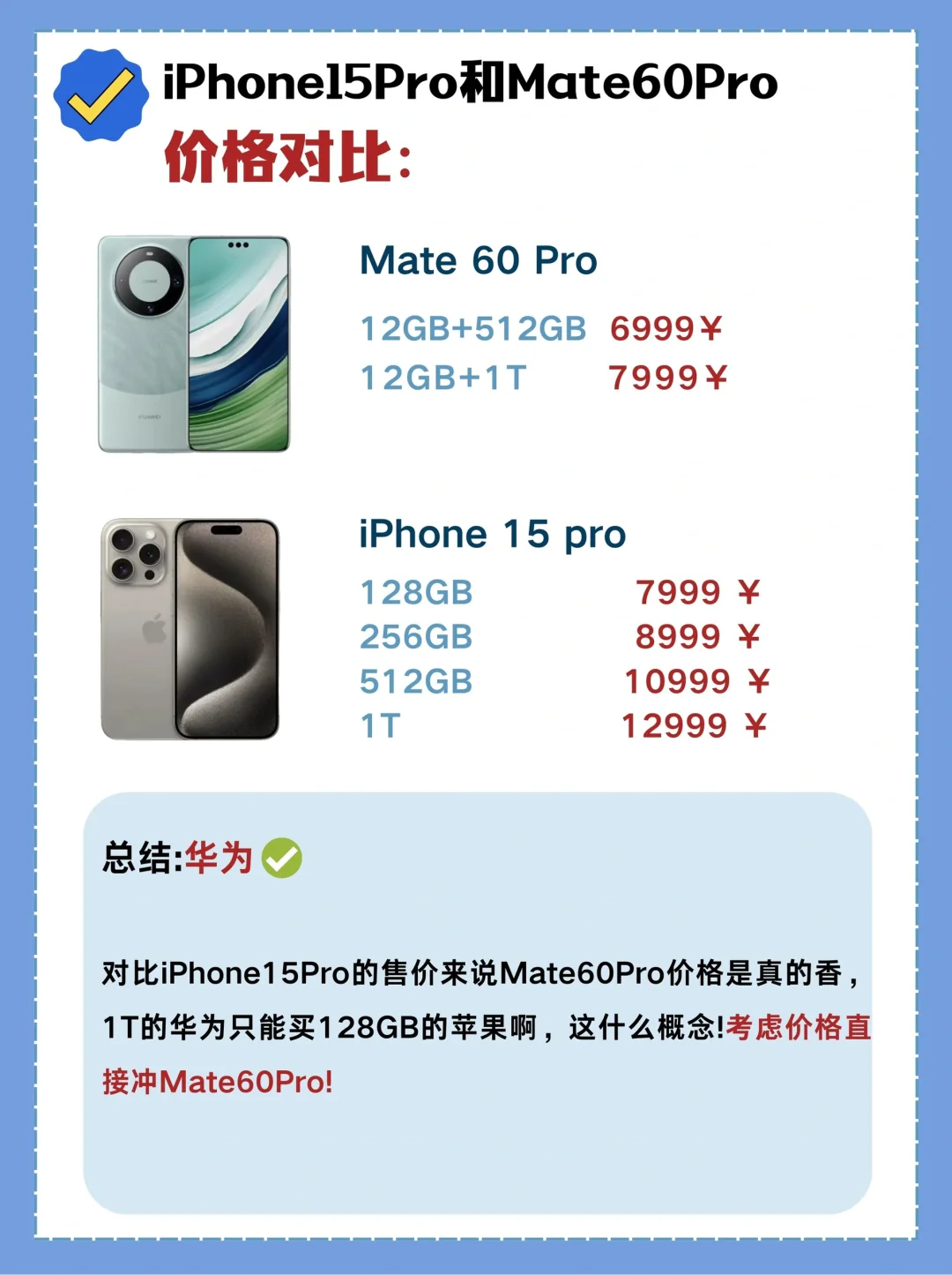 对比iPhone15Pro的售价来说Mate60Pro价格是真的香1T的华为只能买128GB的苹果啊,这什么概念!考虑价格直接冲Mate60Pro!