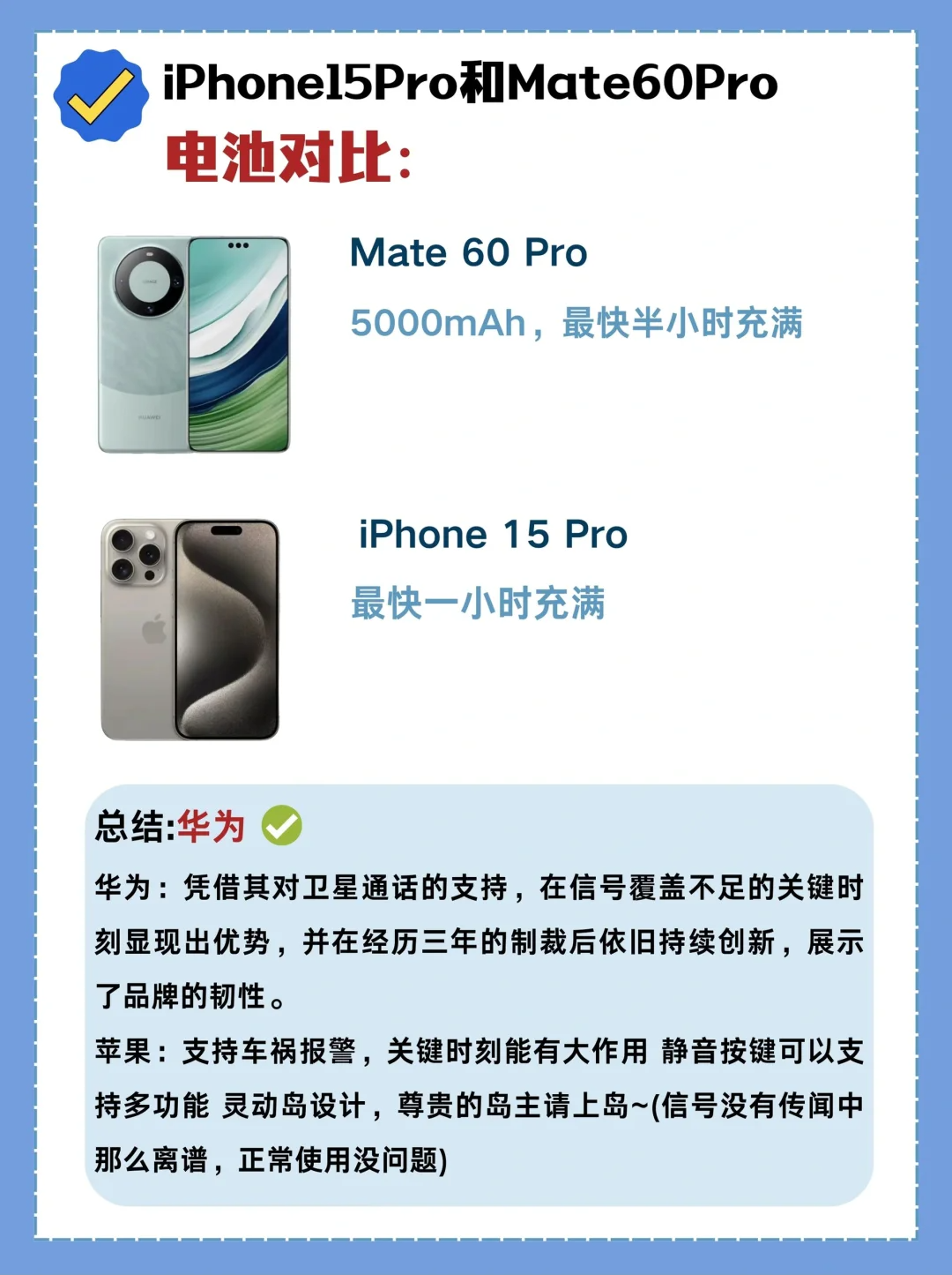 选择iPhone15Pro还是华为Mate60Pro?这确实是很多人琢磨不定的选择,为了解决这个问题,今天我亲自制作了一张两款手机的对比图,以最公正且理性的方式分析二者优劣,希望能够为大家提供购买时的参考。