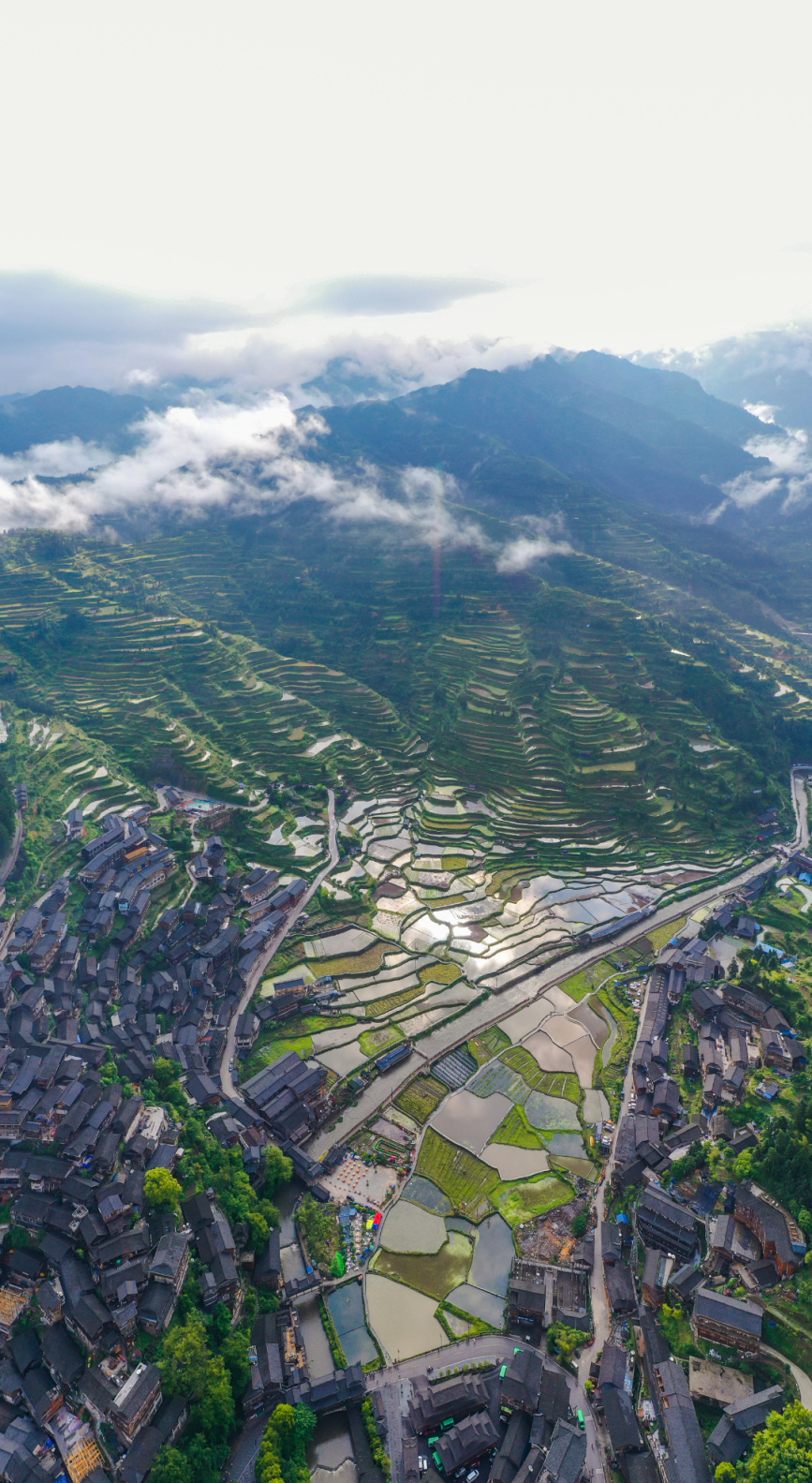 寨内吊脚木楼层层叠叠,顺山而建