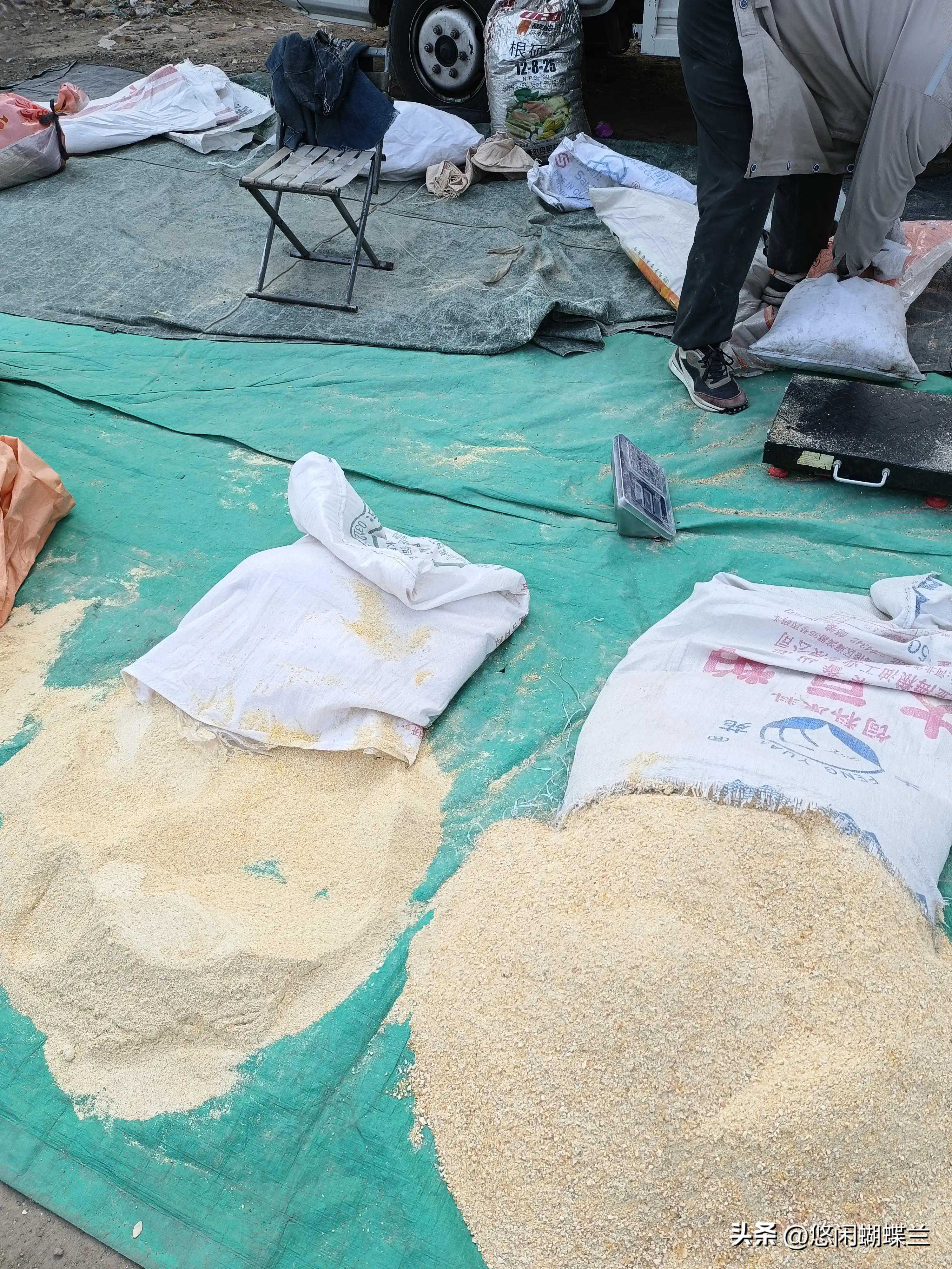 这家卖的鸡料,有兑好的,也有单卖的,玉米,麸子,豆饼,鱼粉,贝壳粉都有。