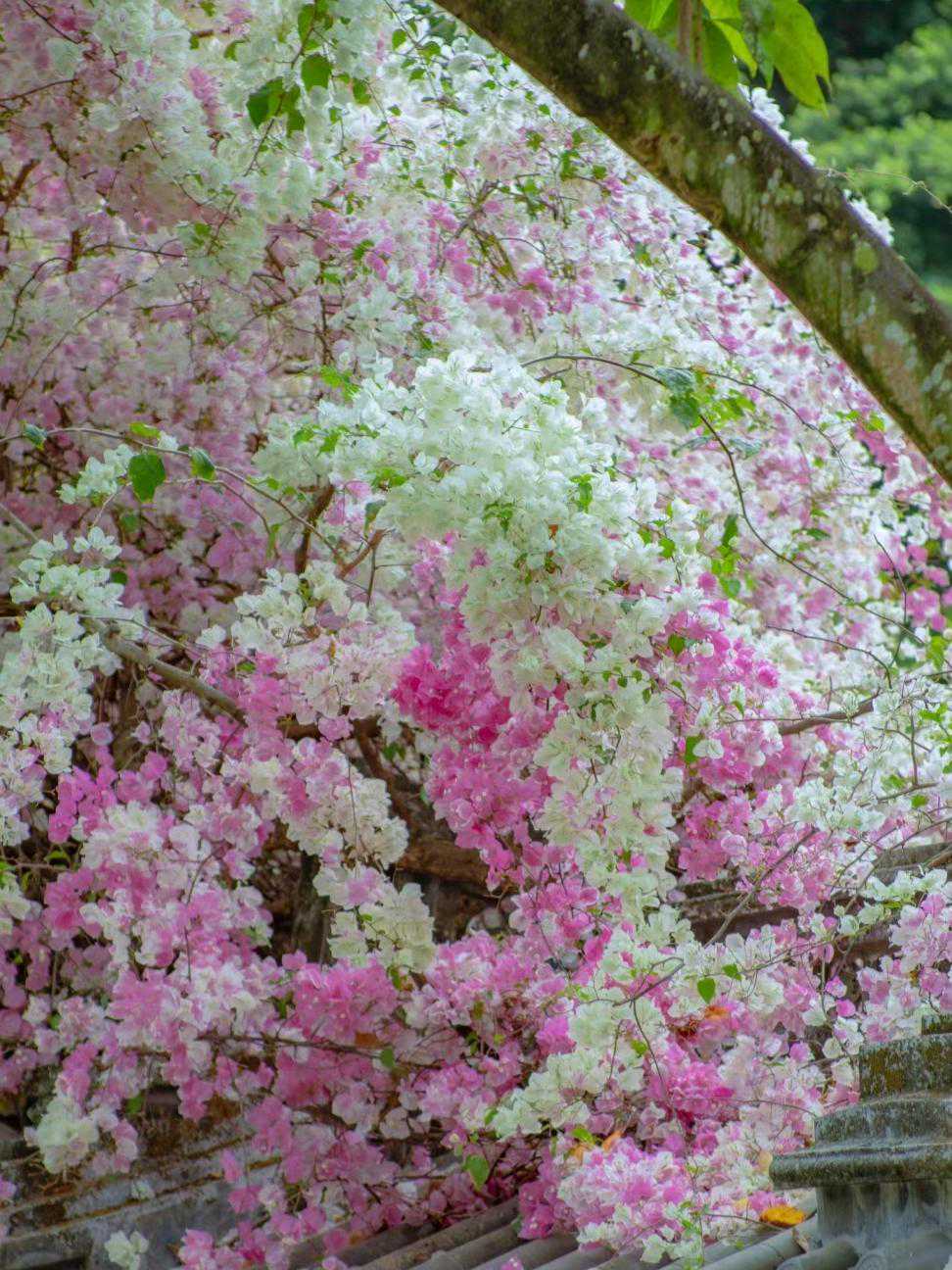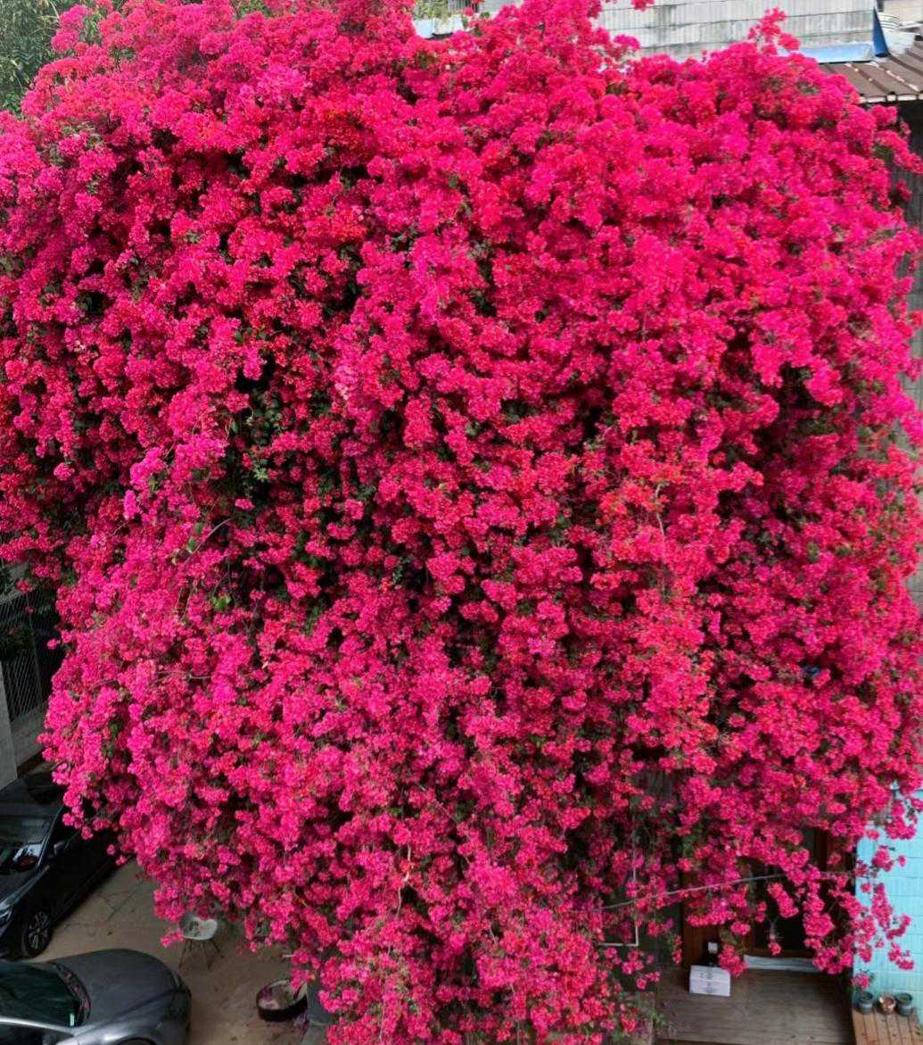 三角梅喜欢光照充足的温暖环境,耐热耐晒耐高温,还耐干旱,华南地区就是它的开挂区,随便地栽,不用花太多时间打理,它都花开满枝。