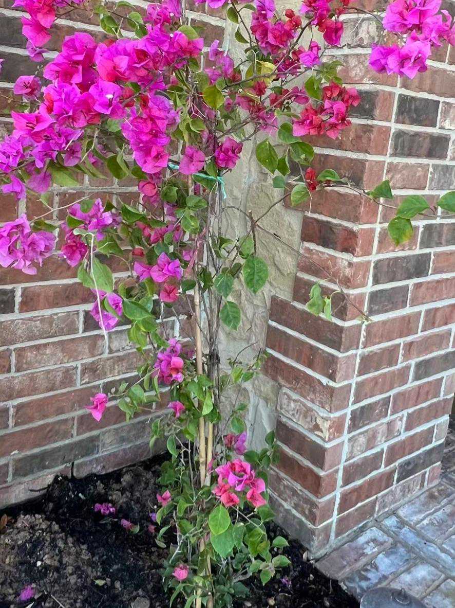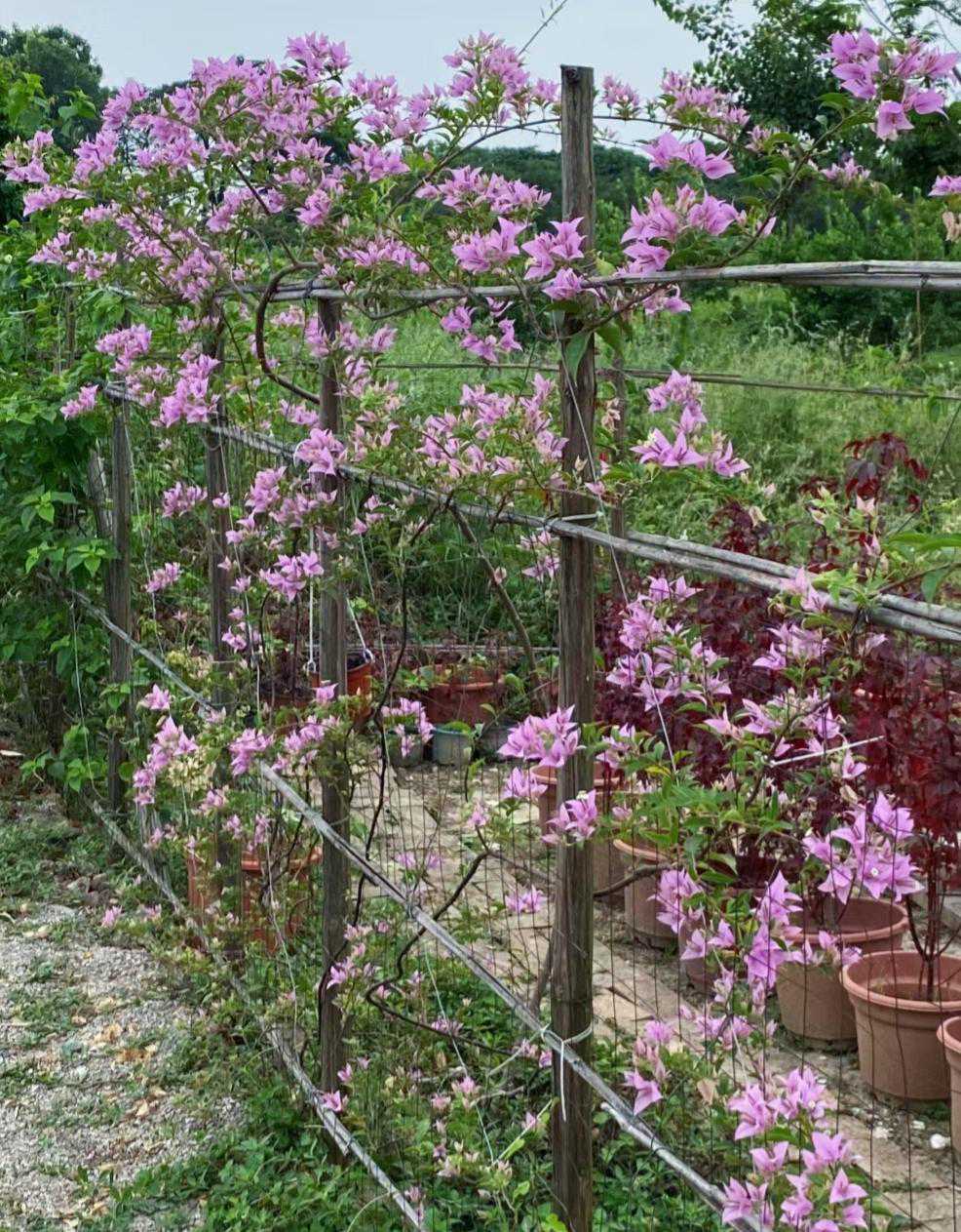 三角梅花枝自然生长会比较凌乱,最好幼苗时期就往栏杆或者墙面牵引,建议买十字架或者拱门架,动手能力强的也可以自己用竹竿或者铁丝做十字架。