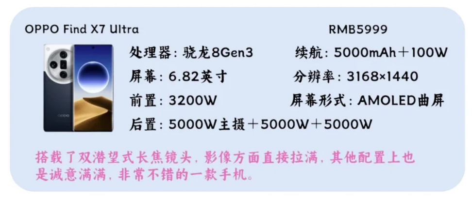 搭载了双潜望式长焦镜头,影像方面直接拉满,其他配置上也是诚意满满,非常不错的一款手机。