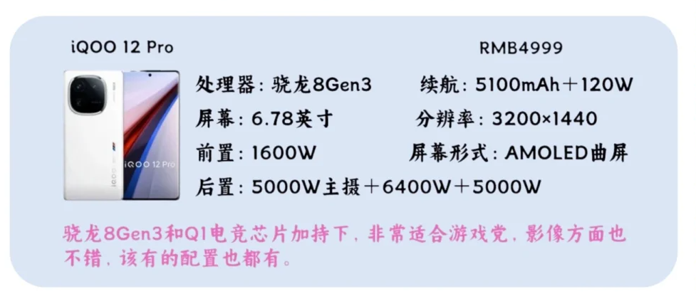 骁龙8Gen3和Q1电竞芯片加持下,非常适合游戏党,影像方面也不错,该有的配置也都有。