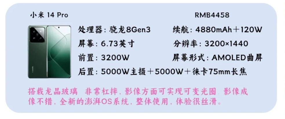 搭载龙晶玻璃非常杠摔,影像方面可实现可变光圈1、影像成像不错,全新的澎湃OS系统,整体使用,体验很丝滑