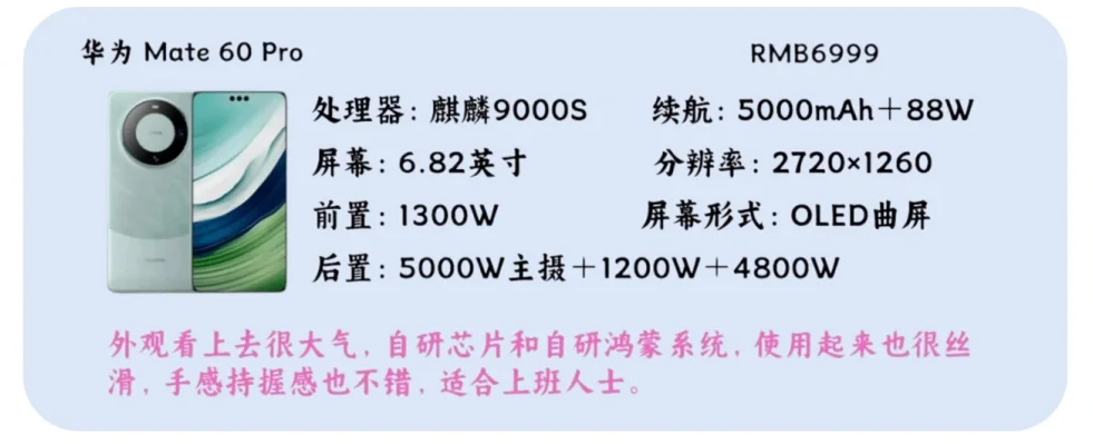 外观看上去很大气,自研芯片和自研鸿蒙系统,使用起来也很丝滑,手感持握感也不错,适合上班人士。