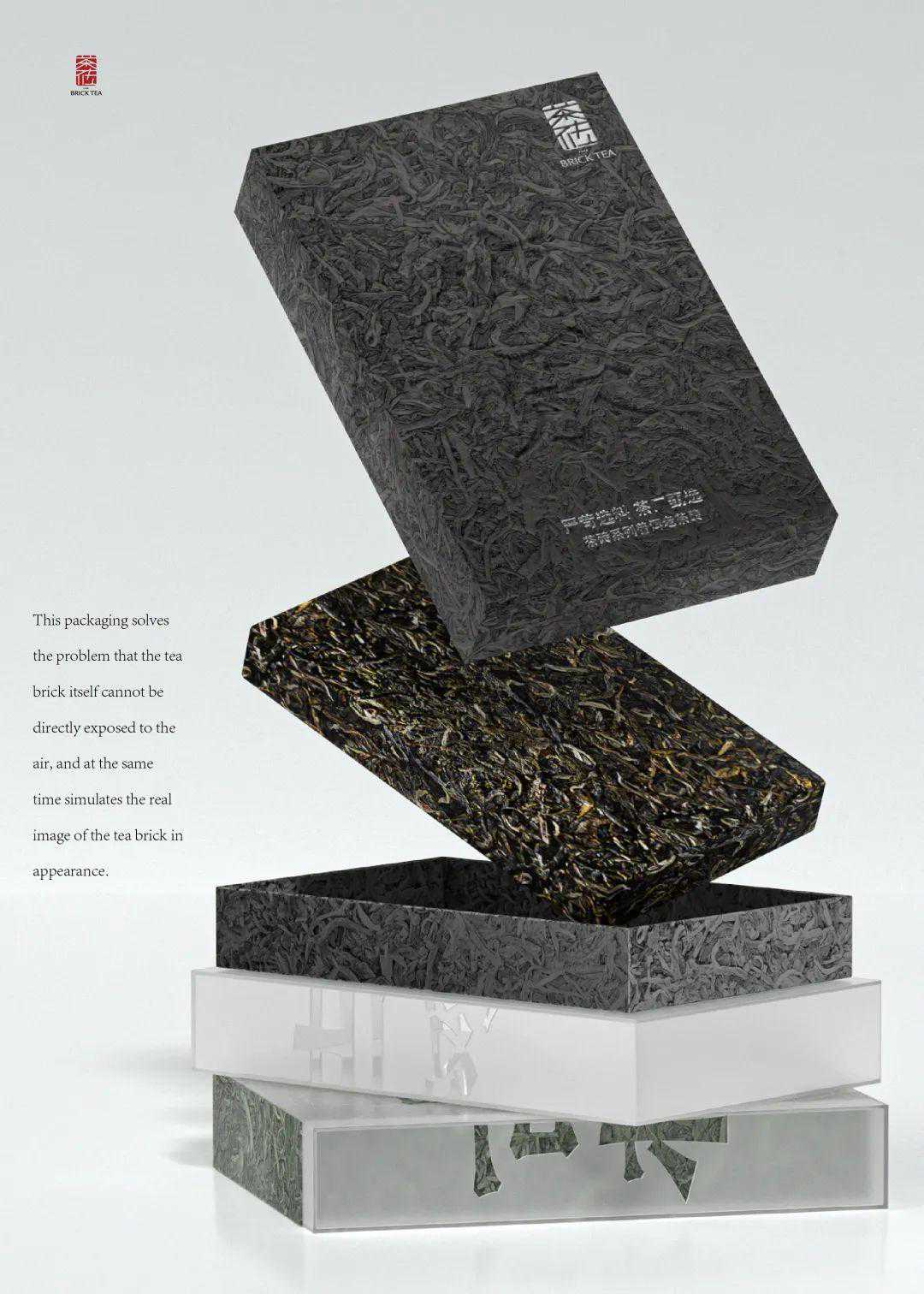该包装是为来自中国云南的Pu'er茶产品而设计的。Pu'er茶的成品形式是砖的形状。压迫状态是紧凑的,不能直接暴露于空气中。此包装解决了产品本身不与空气接触的需求,同时保留其质地和茶状态。独特的功能是在最大程度上恢复茶砖本身的状态,这与市场上的茶包装不同。