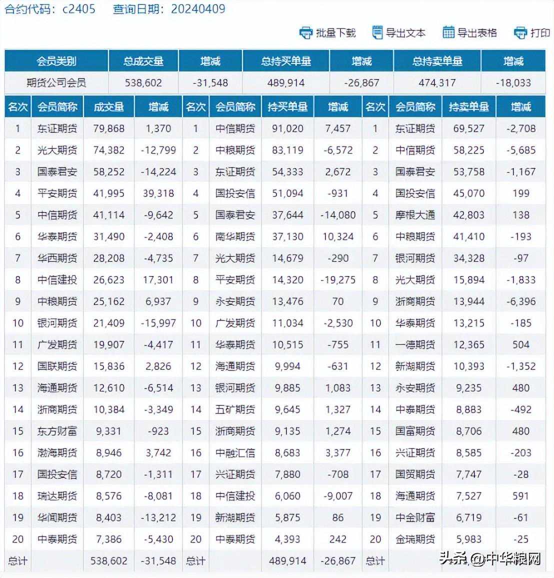 期货方面,周二大连玉米期货主力合约继续减仓。截止15:00收盘,玉米主力C2405合约收盘于2415元/吨,盘中最高2421元/吨,最低2410元/吨,比上一日结算价略微增加2元,涨幅0.08%,但较昨日收盘价下降4元,较上周同期收盘价回落18元。总体看4月9日C2405合约日内仓差减少20624手,至60.3万手。