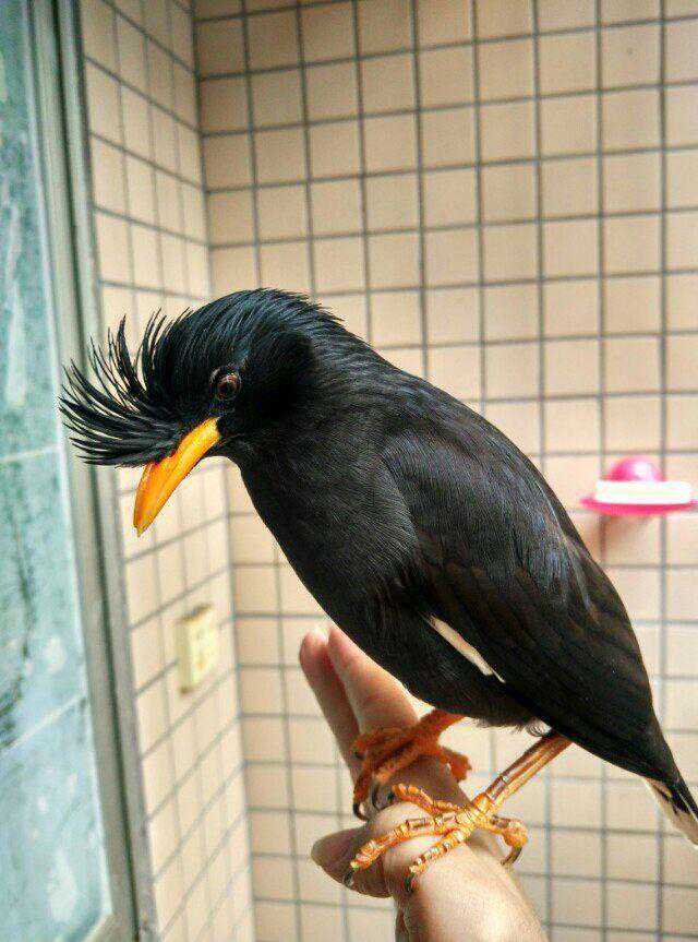 林八哥外观和黑八哥比较相似,翅膀有白色羽毛飞翔的时候非常明显,尾亦具显著的白色端斑,尾下覆羽白色。嘴和脚橙黄色。如图1所示林八哥幼鸟。图2图3是成年的林八哥,同黑八一样成年之前没有冠羽,成年之后鼻子上有一束非常漂亮的冠羽,比黑八的更大而且更可贵的是它的冠羽会随着情绪的变化而变化,时而倒在头上,时而竖起来散开像一朵花,特别漂亮。幼鸟分辨首先林八哥的嘴和腿基本从小都是黄色,给人一种贵族的感觉。尾羽有差不多接近一半都是白色覆盖,每只林八哥尾巴从小都有很大一部分白色的羽毛。不会分辨的拿我发的黑八图和林八图对比下,林八哥体型没有黑八大,学语能力理论上不亚于黑八,伯仲之间。飞行速度比黑八更快,训练起来比黑八容易,而且林八哥天生认主,而黑八哥认主大多数靠主人训练。警惕性非常高。因为林八哥相对来说分布在中国部分地区,所以价格比黑八稍微贵一点点。上市也稍微晚一点。