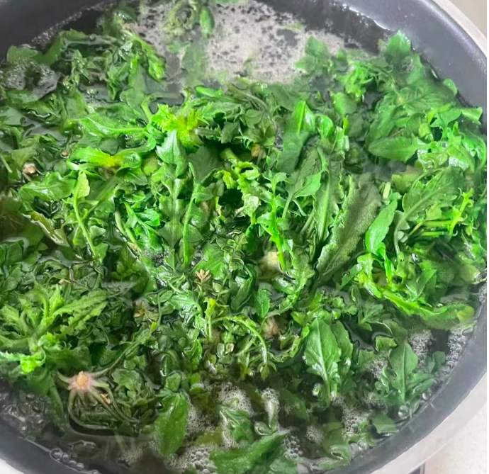 2、沸水下入蒲公英焯水,加入少许的油和盐,焯水后捞起。过凉水挤干水分。