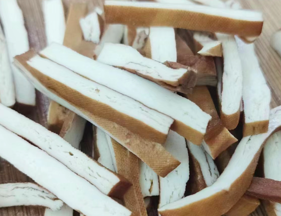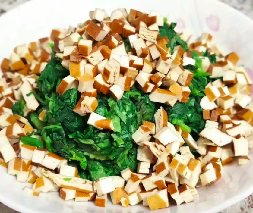 3、香干焯水煮一下,起锅洗净切成香干丁。
