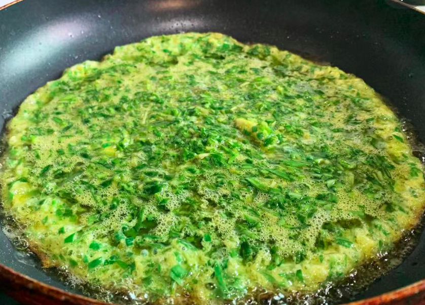 5、热锅凉油,倒入蒲公英鸡蛋液煎至凝固,两面金黄即可。