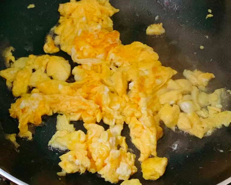 3、热锅凉油,下入鸡蛋煎凝固,然后划散起锅待用。