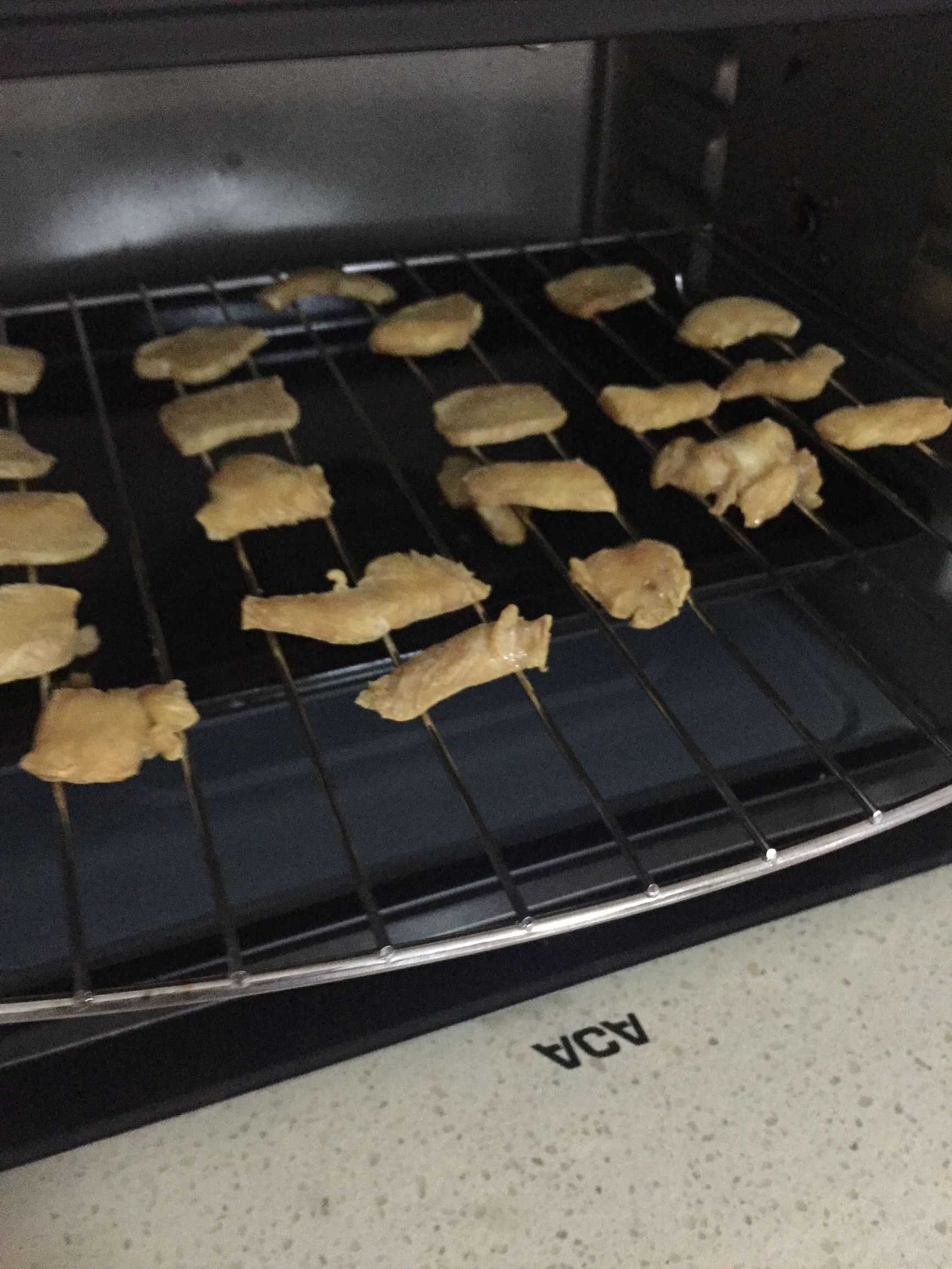 5、翻面,再烤15分钟,香喷喷的鸡肉干出炉!