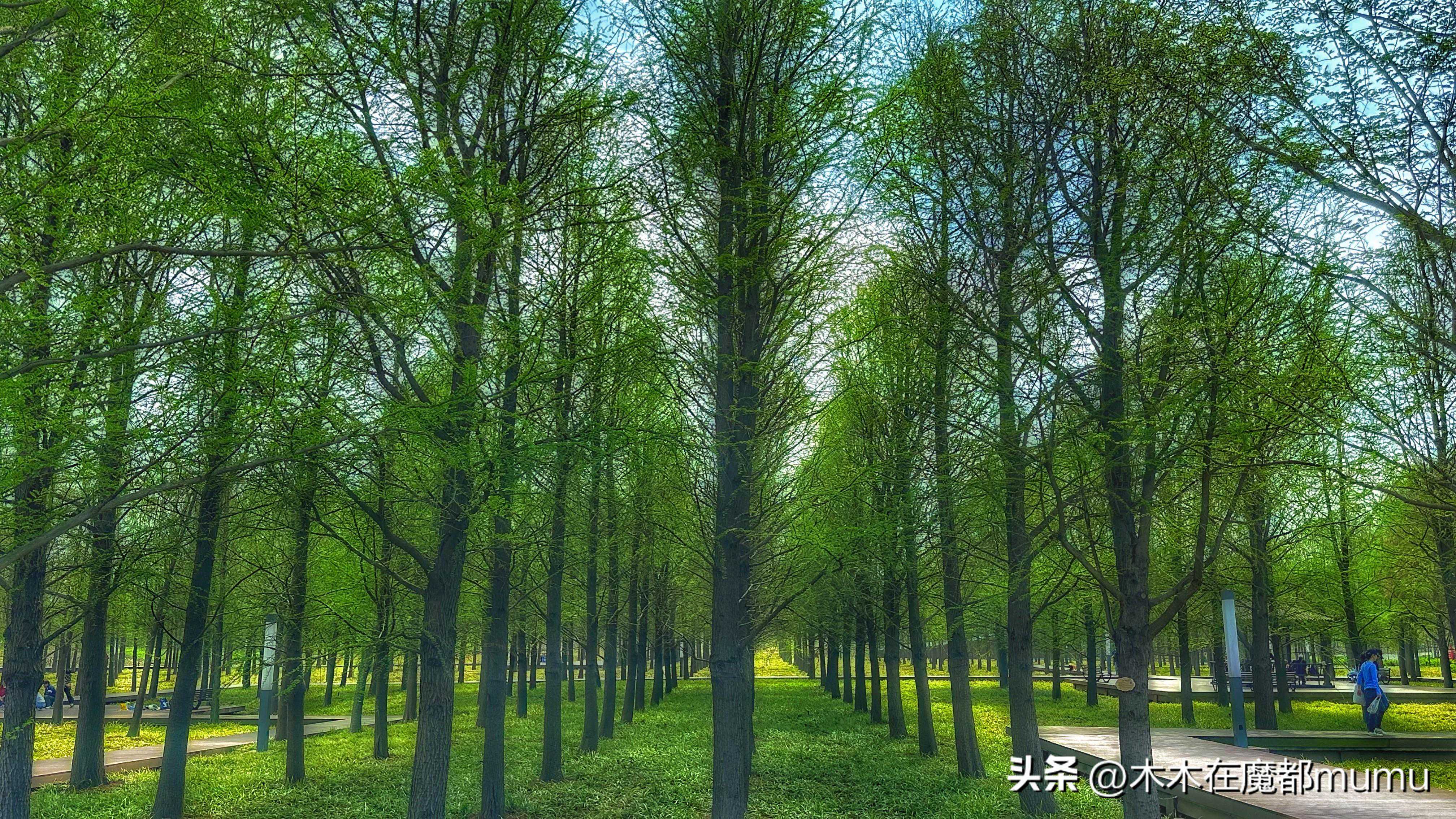 一踏入公园,满目皆是春天的色彩。水杉树已冒出了嫩绿的芽尖,它们像是一串串嫩绿色的珍珠,镶嵌在枝头。阳光透过水杉的枝叶,洒在大地上,形成一片片斑驳的光影。我们漫步在水杉大道上,感受着清新的空气和温暖的阳光,仿佛走进了一幅生动的春日画卷。