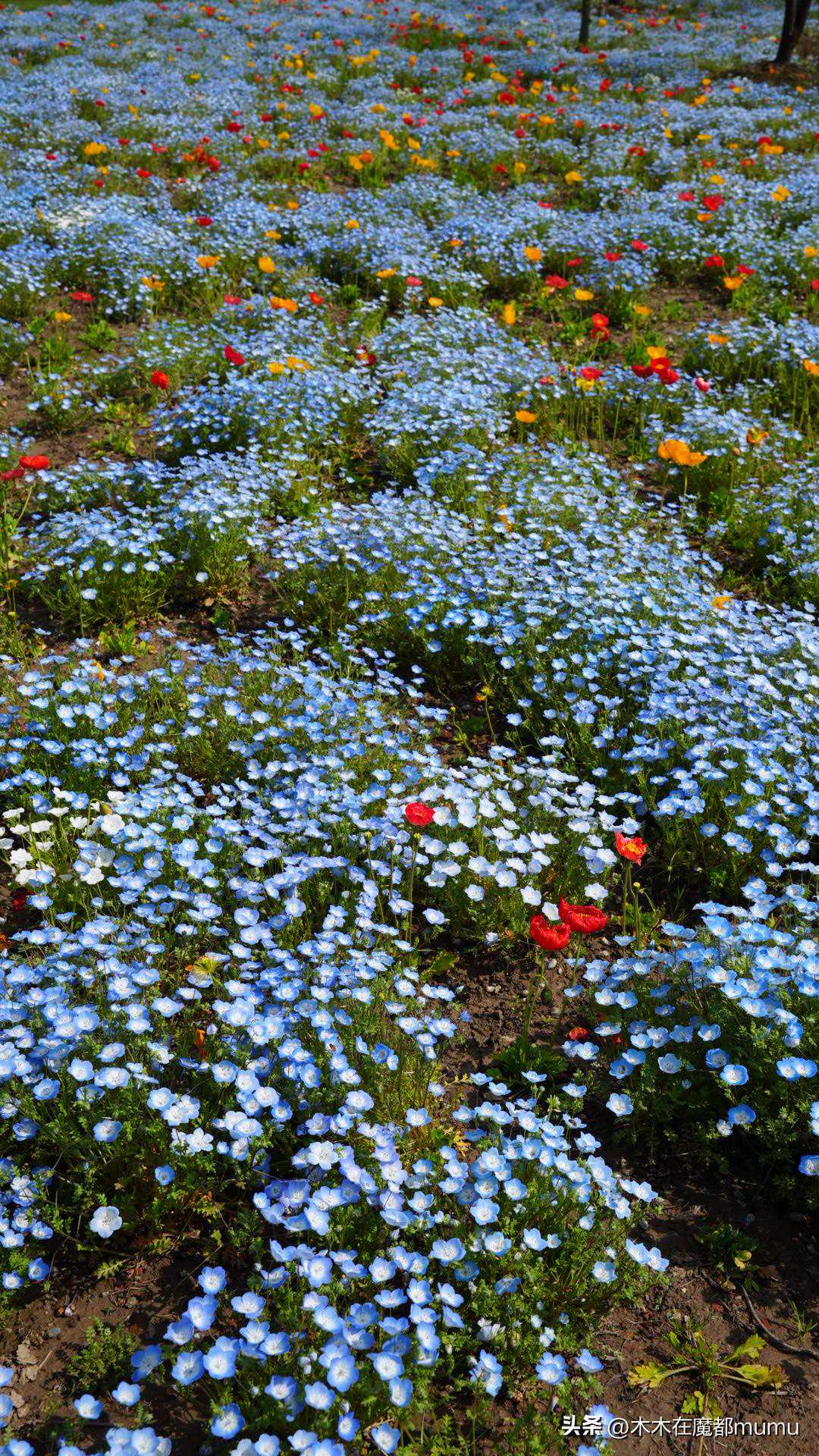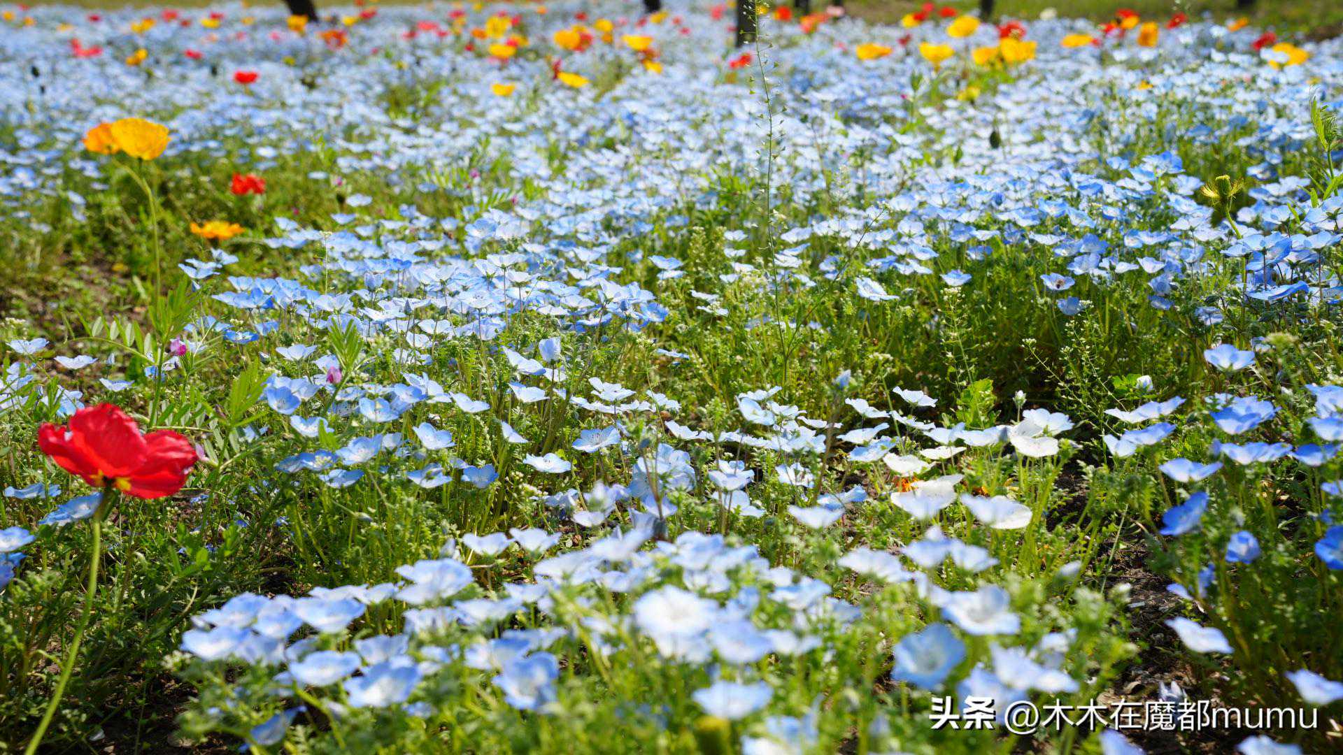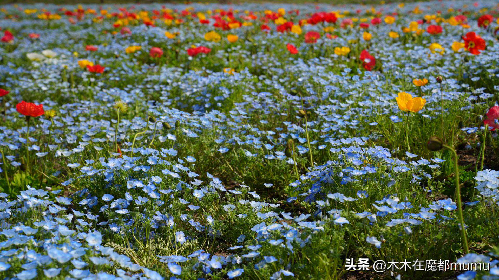 粉蝶花又叫喜林草,它可不是粉色的,而且是一种纯净的蓝色小花,小小的一朵轻盈地铺满了大地,与各种颜色的虞美人交织在一起,红的、黄的、白的,色彩斑斓,绚丽夺目。