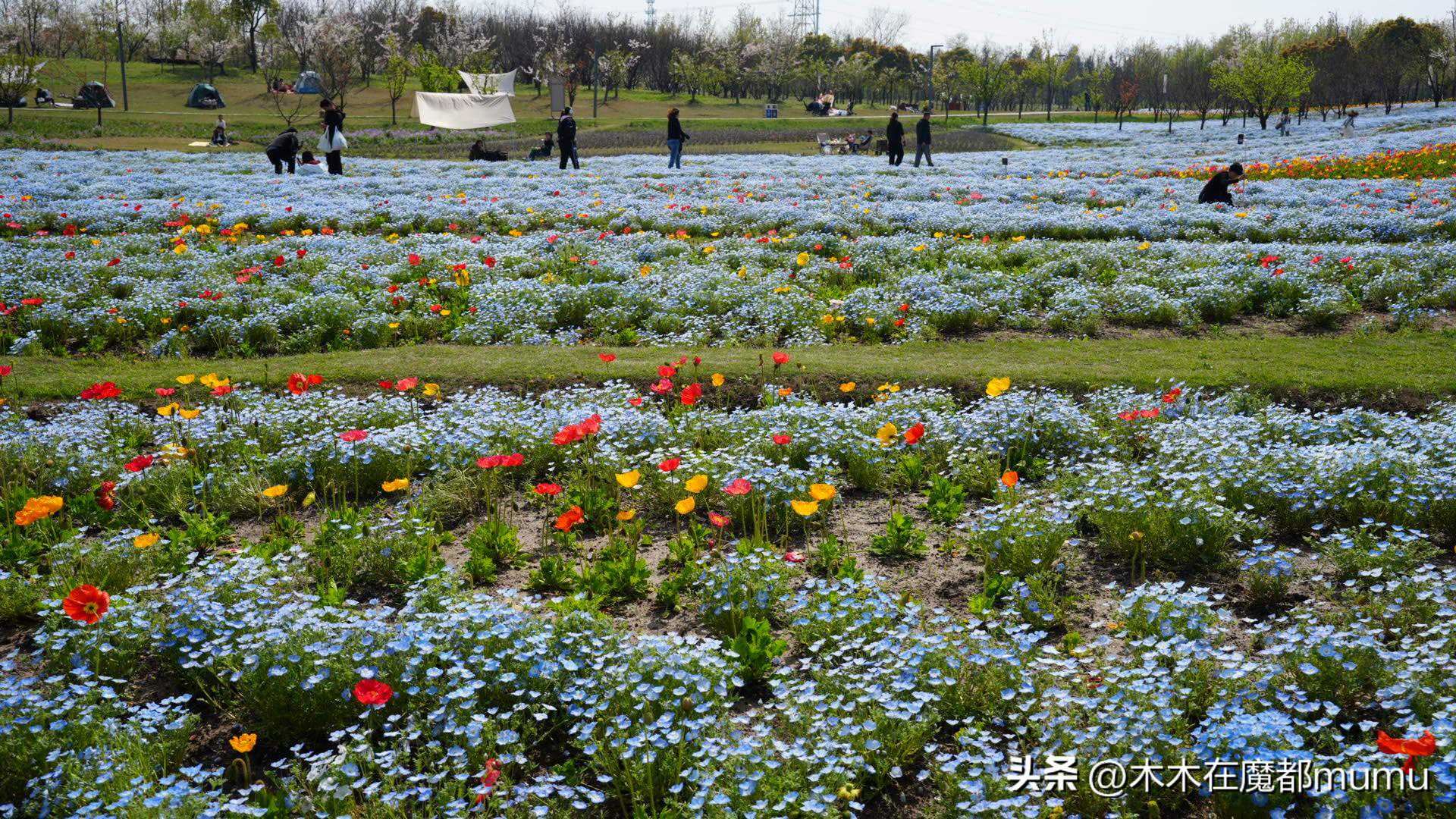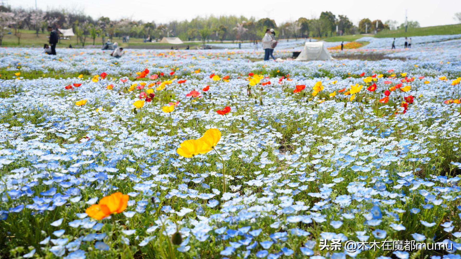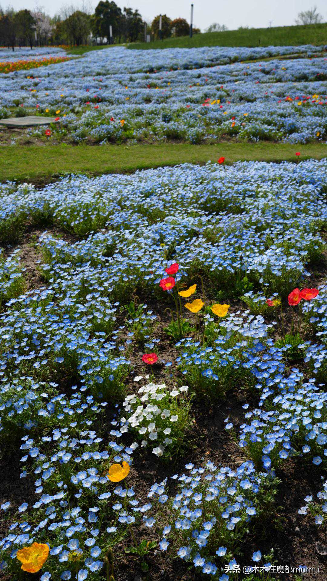 粉蝶花又叫喜林草,它可不是粉色的,而且是一种纯净的蓝色小花,小小的一朵轻盈地铺满了大地,与各种颜色的虞美人交织在一起,红的、黄的、白的,色彩斑斓,绚丽夺目。