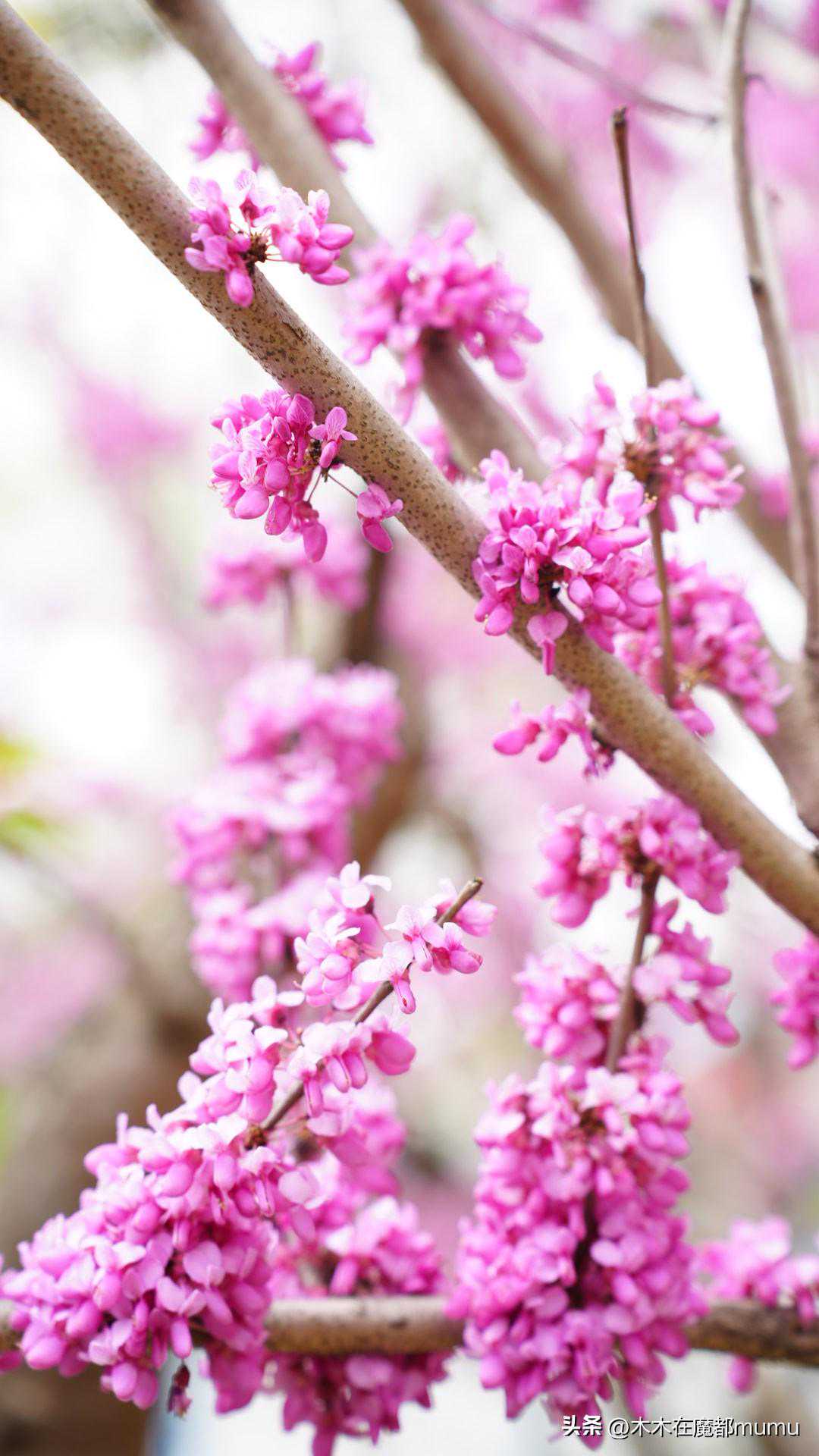 紫荆花开得正盛,它们的花朵小巧而密集,挂满了枝头,仿佛是一片片紫色的云霞落在了人间。